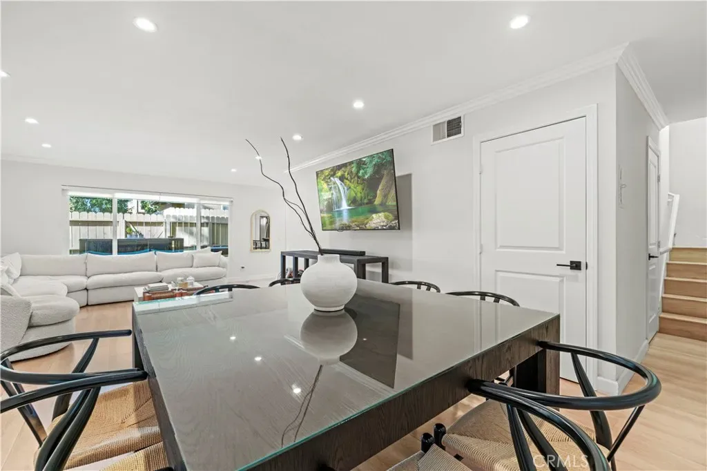 Upstairs features three bedrooms including a primary with walk-in closet. In-unit laundry adds everyday convenience. Recent upgrades include new interior paint, new flooring throughout, dual-pane windows, Nest thermostat, central A/C & heat, recessed lighting, and fresh exterior paint.