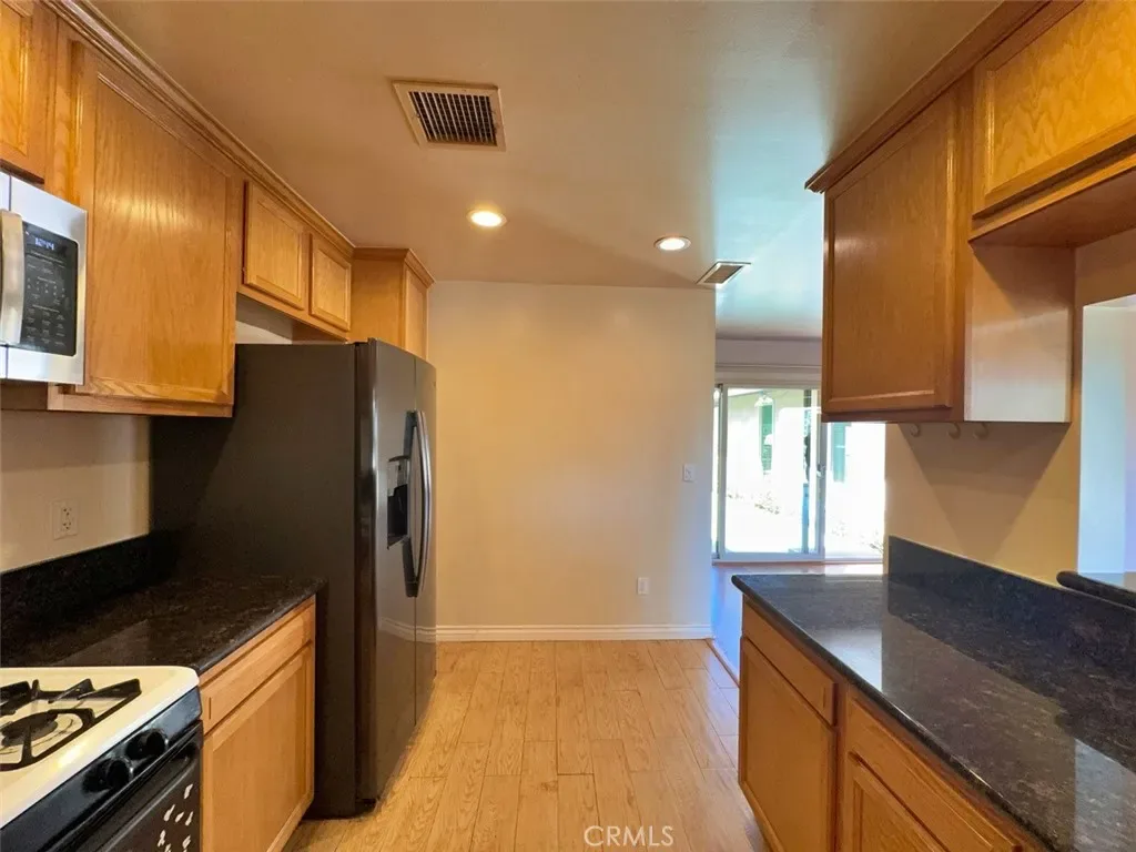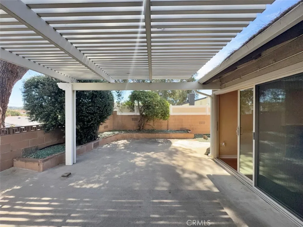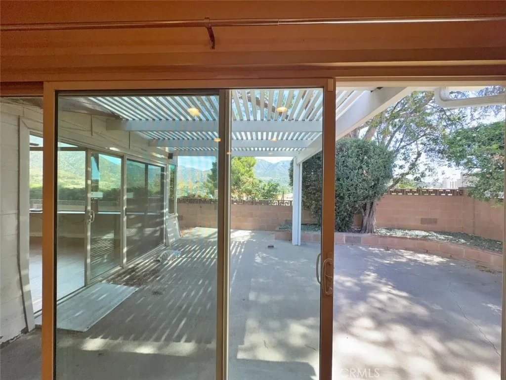 Hardwood floors flow throughout the open living and dining areas, which connect to a well-appointed kitchen featuring oak cabinetry, dark granite countertops, a gas range, and recessed lighting. Large sliding glass doors open to a covered patio with a charming pergola, ideal for al fresco dining with mountain views as your backdrop.