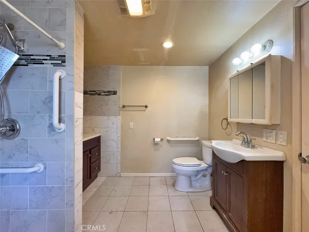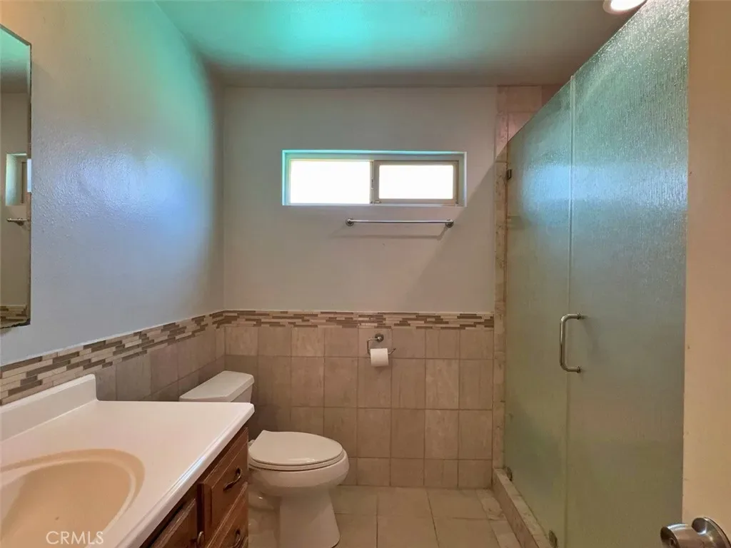 The generous primary suite features a striking natural stone fireplace, recessed lighting, and direct sliding-door access to the pool and backyard. The ensuite bathroom offers a beautifully tiled walk-in shower with marble-style tilework and a decorative mosaic accent band. Two additional bedrooms with hardwood floors and ample closet space share an updated hall bathroom with tile surround and glass-enclosed shower.