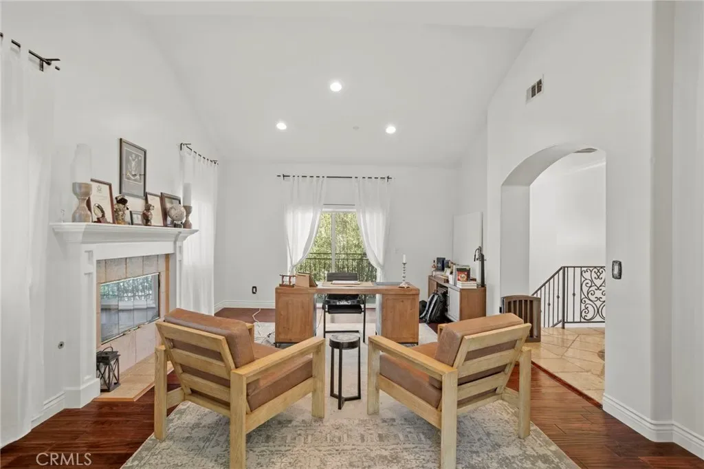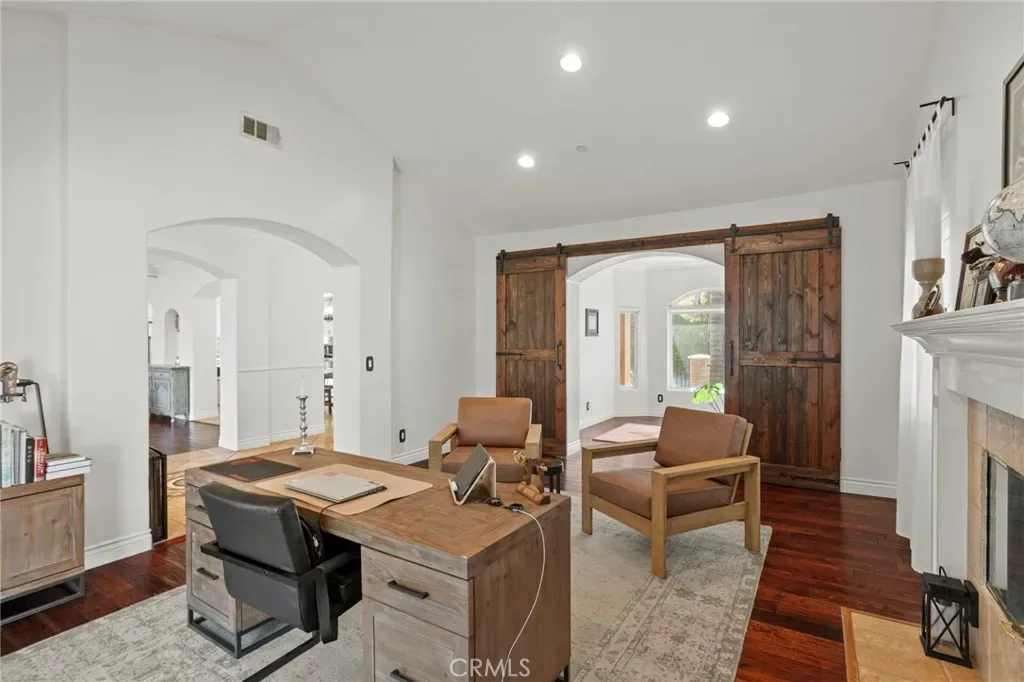 Inside, the home showcases rich wood flooring, tile finishes, high ceilings, recessed lighting, and abundant natural light. The thoughtfully designed floor plan offers multiple living and entertaining spaces, including a formal living room with fireplace, private office with sliding barn doors, and a spacious family room that connects seamlessly to the kitchen.