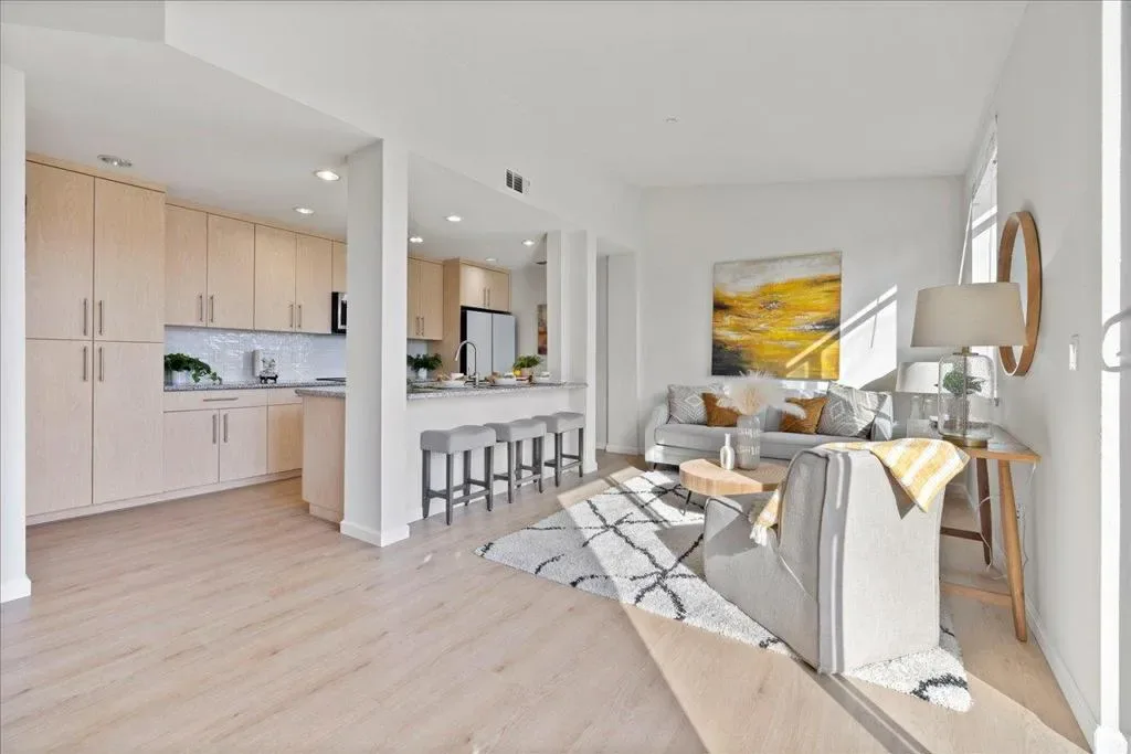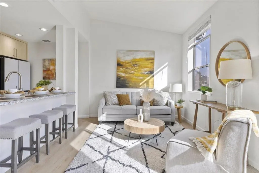 TOP-FLOOR CORNER RETREAT – A RARE FIND! This beautifully updated, light-filled gem with surprising Serenity & Privacy showcases an open living space with a beautiful ISLAND perfect for entertaining guests & family. The sun-drenched living space with CATHEDRAL CEILING & PATIO is elevated by a designer statement Nelson Saucer Bubble Pendant, while both bathrooms shine with stylish modern upgrades, including an elegant Artemide Tolomeo Wall Lamp. SHARES ONLY ONE WALL with a neighbor, offering EXCEPTIONAL PRIVACY. The primary suite comes with a WALK-IN CLOSET, DOUBLE SINKS, and an OVERSIZED SOAKING TUB. Set within a charming BOUTIQUE COMMUNITY of ONLY 34 RESIDENCES, this home offers a rare blend of style, space, and exclusivity. Walking distance to SEVEN SEAS PARK, VTA, and GROCERY OUTLET. EASY ACCESS to Hwy 101 & 237 and major tech employers. Complete with 1-CAR ATTACHED GARAGE, 2nd DESIGNATED PARKING SPACE, STORAGE CLOSET, AMPLE GUEST PARKING & STREET PARKING. Don’t miss this rare opportunity to own a home that truly offers lifestyle and pride of ownership!