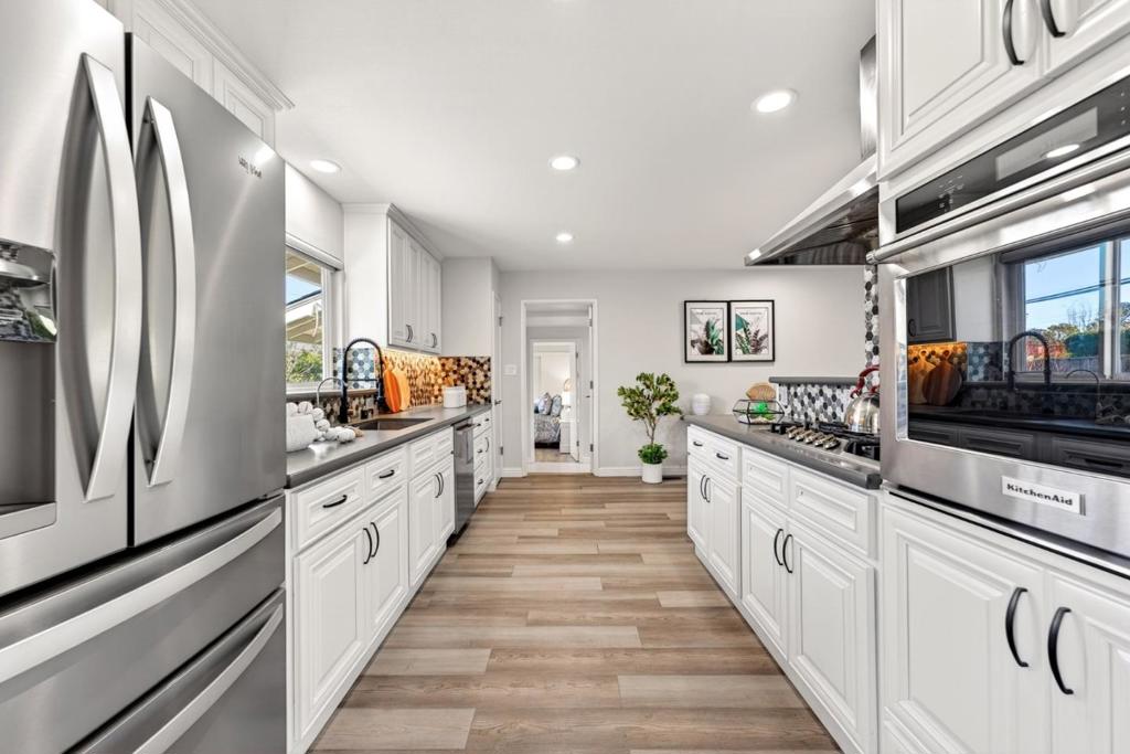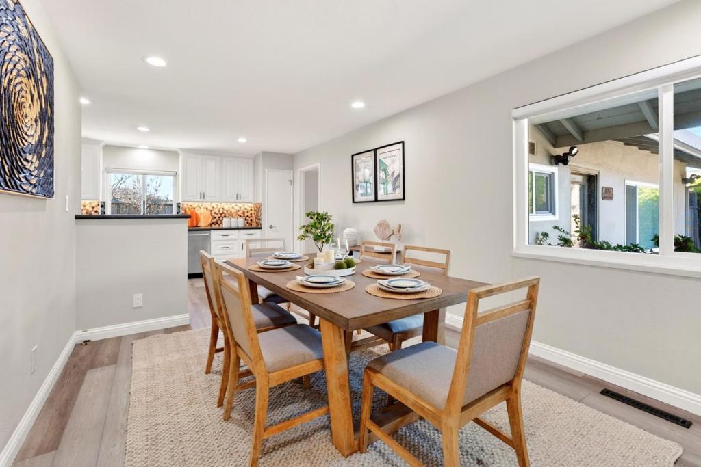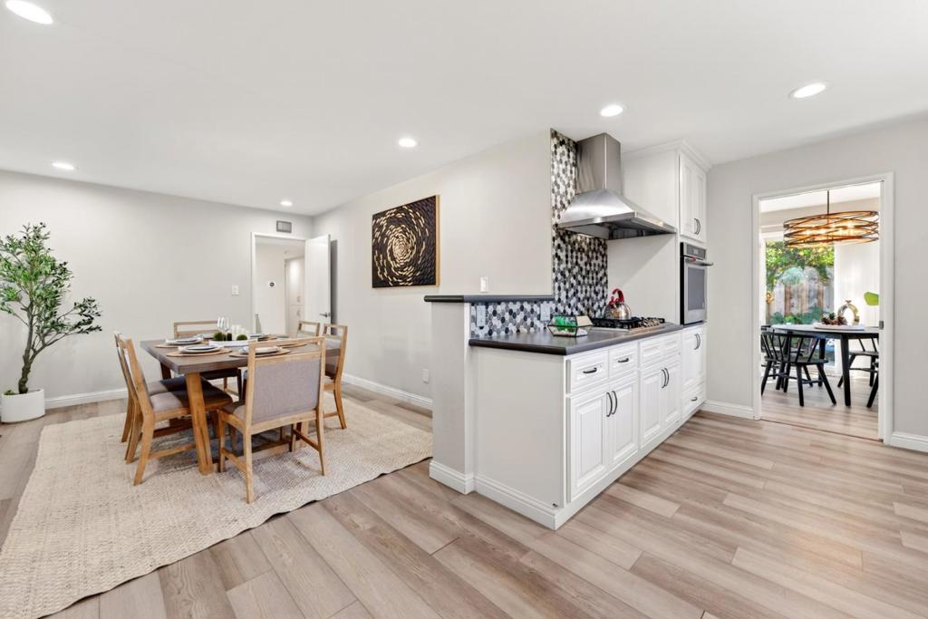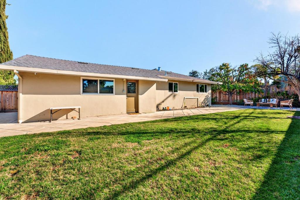 Discover this stunning 2,086 sq ft single-family home, perfectly situated in the heart of Sunnyvale. Built in 1956 and extensively remodeled, this 5-bedroom, 2-bathroom residence beautifully blends classic mid-century structure with sophisticated contemporary design. The open-concept living area features elegant wide-plank flooring and a marble fireplace that serves as a focal point for the light-filled room. A chef-inspired kitchen is a true showstopper, boasting sleek white cabinetry, a dramatic tile backsplash, and premium stainless steel appliances. Enjoy seamless entertaining in the expansive dining areas, which flow effortlessly through sliding doors to a private backyard retreat featuring a lush lawn, patio, and mature fruit trees. The primary suite offers a serene escape, while additional bedrooms provide flexible space for a home office. Updated bathrooms showcase modern vanities and high-end glass-enclosed showers with marble-style tiling. This move-in-ready home also includes a dedicated laundry room and a wide driveway with ample parking. Located in a prime Silicon Valley neighborhood, this property provides the perfect balance of style, comfort, and convenience.