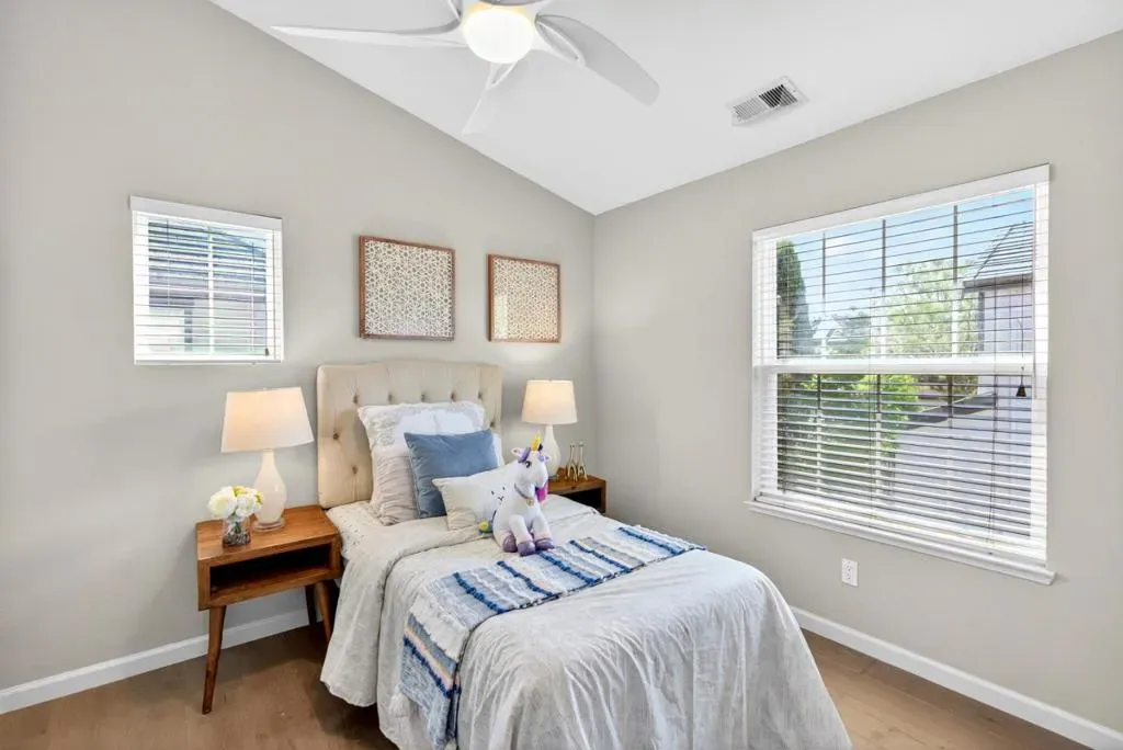 Newly remodeled, towering two-story beauty nestled on a peaceful street. Ideally located near highly rated schools, Columbia and Fair Oaks Park, major tech campuses, and under two miles from Downtown Sunnyvale and its Caltrain station, this home offers both convenience and an exceptional lifestyle. Inside, wide-plank oak flooring leads into a stunning, freshly painted living room with soaring vaulted ceilings, highlighted by a striking mid-century chandelier, while dual-pane windows fill the home with natural light. Heat/AC, along with a cozy fireplace, provide year-round comfort. The updated kitchen/family room features high-end stainless steel appliances, quartz countertops and beautifully re-painted cabinetry. All bedrooms are comfortable and include their own closets, while the primary suite showcases a spa-like en-suite bath with a double vanity, oversized soaking tub, separate shower, and a spacious walk-in closet. Additional highlights include a two-car garage, a dedicated laundry closet with washer and dryer, and a private, sun-drenched backyard with lush landscaping, featuring a variety of plants, flowers, and trees. With easy access to Highway 101 and Central Expressway, this is an exceptional opportunity in one of Sunnyvales most convenient locations. It will go FAST!