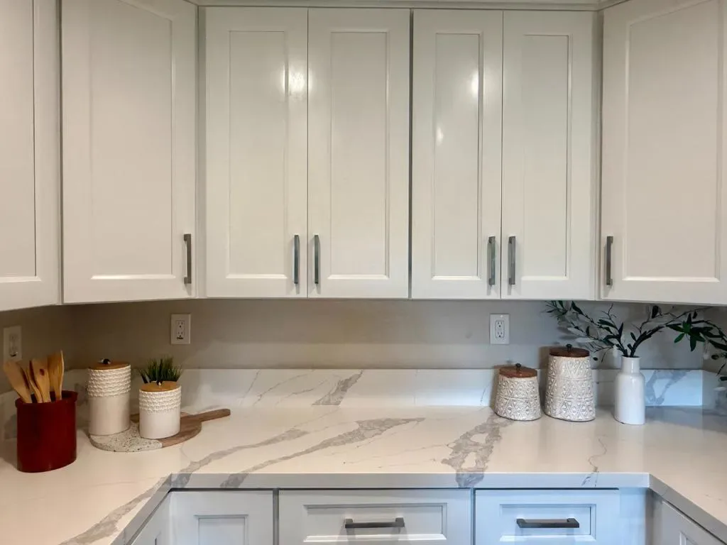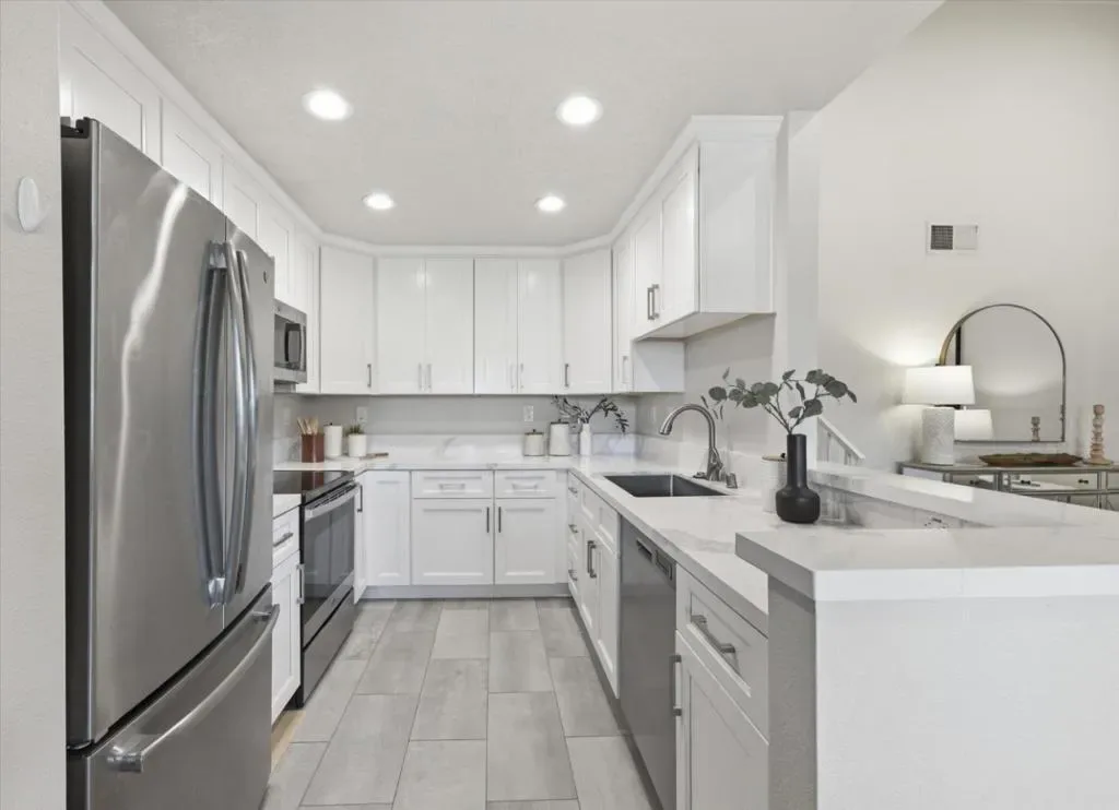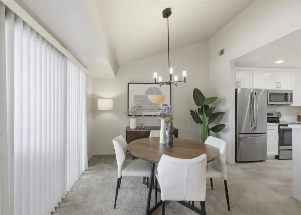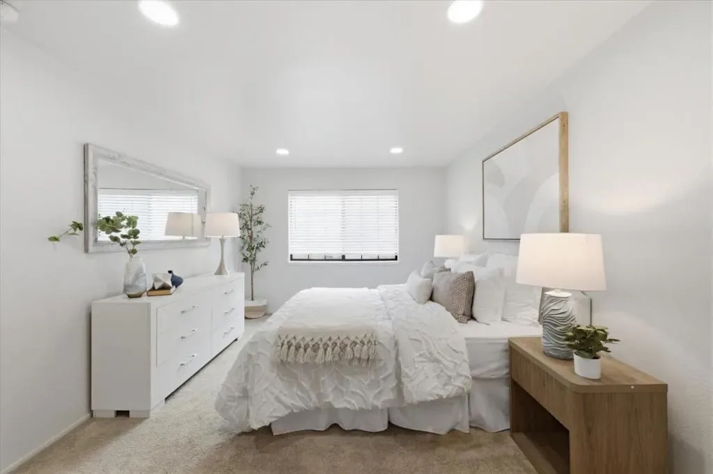 A Sanctuary of Contemporary Luxury! Step into a beautifully remodeled in 2021, top-floor condominium where natural light and modern design converge. The expansive living room features vaulted ceilings and recessed lighting throughout, creating an atmosphere of effortless sophistication. An elegant chandelier elevates the space, guiding your attention to a glass sliding door that opens to a sunny, covered outdoor patio with open green view. The remodeled and open kitchen is a testament to style, featuring shaker-style cabinets, sophisticated quartz counters, and stainless steel appliances. Retreat to the spacious primary suite with ample closet space, an updated vanity and countertop, complete with a shower with tile surround and glass enclosure. A guest bathroom features a newer shaker-style vanity, and quartz countertop, ensuring both comfort and style for your guests. Additional features include: Indoor washer & dryer, central heating and air conditioning, elegant single panel interior doors, natural lighting throughout and 2-car tandem garage. Prime location in the back of a well maintained complex with swimming pool, club house & convenient to park, shopping, downtown Mountain View & Sunnyvale, near Apple and Linkedin + easy access to freeway & expressway. You will love it !