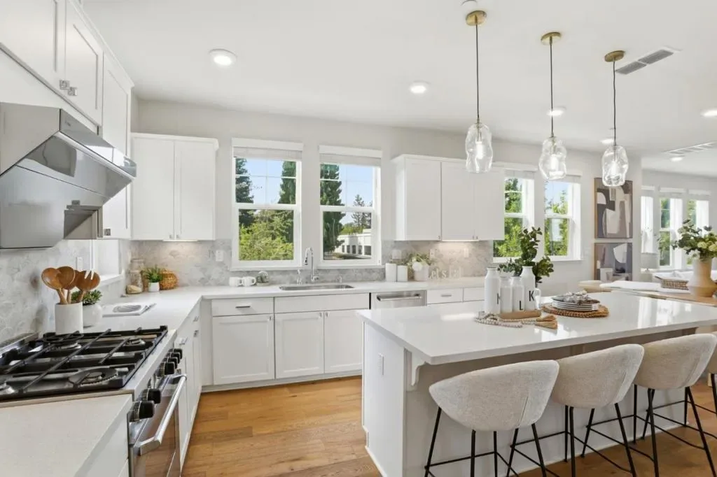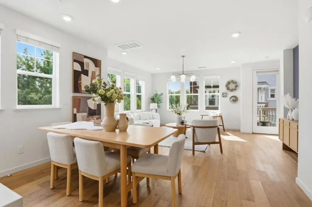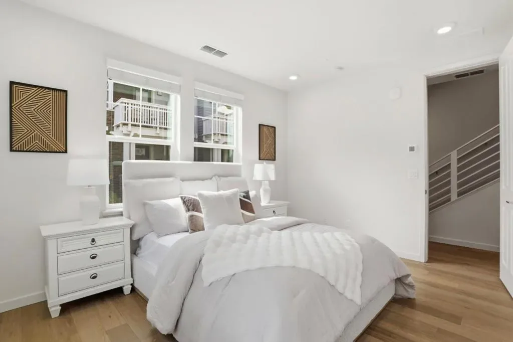 Exceptional 7-year-old end-unit townhome stands out with its exquisitely upgraded, designer-inspired interior and is tucked away in the most quiet and private location within Sunnyvale’s premier community, The Vale. The home is elevated by premium wood floors and a gourmet kitchen and bathrooms featuring elegant white cabinetry paired with beautiful quartz countertops and upgraded backsplashes, all bathed in abundant natural light from windows on three sides. The flexible layout includes a private ground-floor suite, a dedicated laundry room, and a magnificent primary retreat with soaring 13-foot ceilings, while modern conveniences include an EV-ready garage and a Nest smart-home system. Perfectly positioned for both education and lifestyle, you are within easy walking distance to the prestigious private school, The Kings Academy, as well as grocery stores, restaurants, and three city parks. With a low HOA that covers water and garbage and provides access to resort-style amenitiesincluding a clubhouse, parks, and a vegetable gardenyou are also just minutes from Lawrence Expy, Hwy 101, and major tech campuses such as Google, Nvidia, Apple, and LinkedIn.
