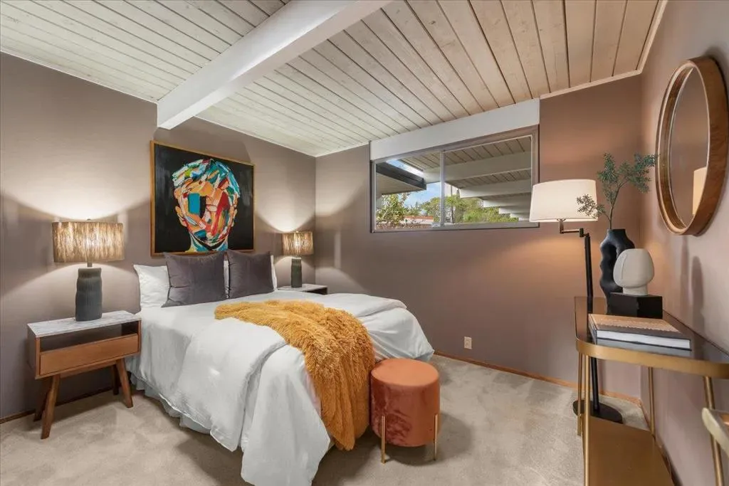 Remodeled Iconic Eichler on a rare 12,000 sf lot w/a separate ADU featuring high ceilings, kitchen, living room, bedroom & full bath. Authentic characteristics treasured to this day: Open concept living, stylish beams, soaring w/natural light through floor-to-ceiling windows framing the gorgeous outdoors, original Eichler ceiling stain, globe lighting, Italian tile flooring, & much more. Serenely situated w/a private front courtyard w/a welcoming expansive deck w/a soothing fountain. The Chef’s Remodeled kitchen features a Thermador 5 burner gas range, Thermador oven, Bosch dishwasher & KitchenAid refrigerator. Plenty of prep space on granite slab counters w/abundant cabinets, island seating & a breakfast nook. The living room features a cozy fireplace & separate dining area. The spacious family room is a huge bonus w/new carpeting. The primary features a walk-in closet & remodeled bath. The hall bath has been updated w/designer tile & edgeless glass. The park-like backyard enjoys a large grassy area for play surrounded by mature plants. Located in a fabulous neighborhood w/2 parks & close to shopping, Apple, Nvidia, Google & other Major Silicon Valley Employers. Excellent Schools: Stocklmeir Elementary, Cupertino Middle, & Fremont High.