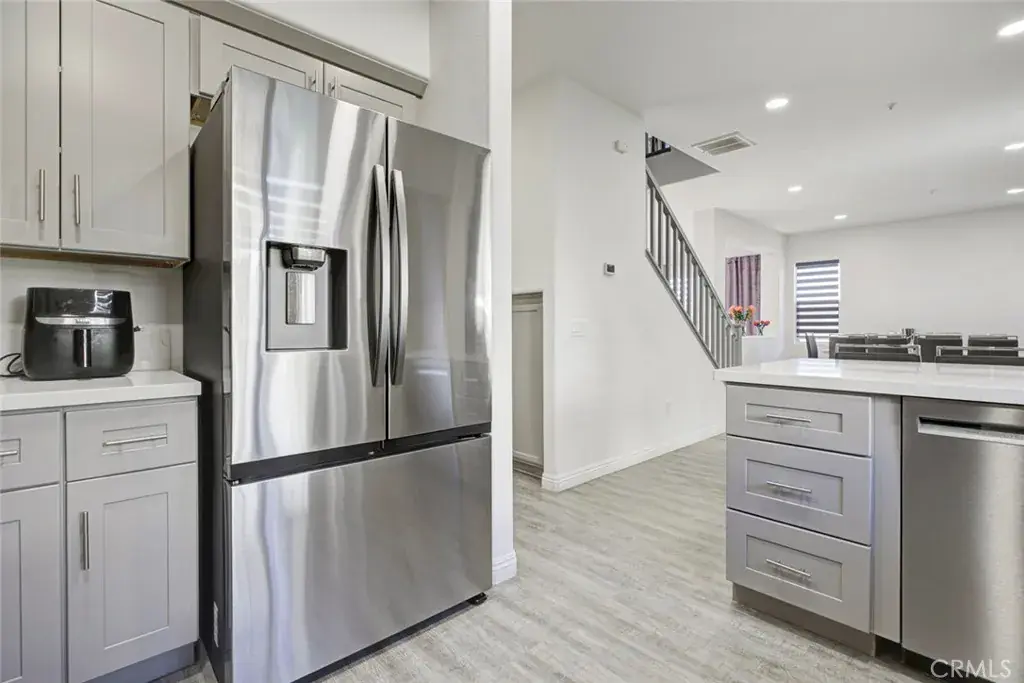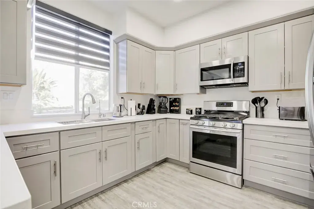 The remodeled kitchen showcases quartz countertops, gray shaker cabinets, and stainless steel appliances—perfect for both everyday living and entertaining.