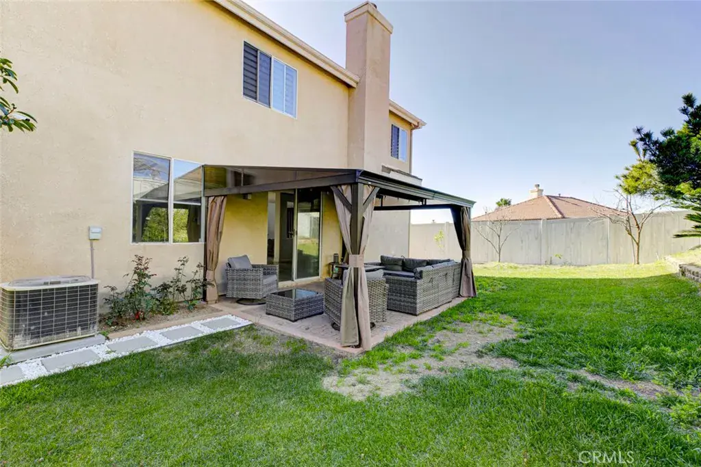 Step outside to your private backyard oasis featuring pavers, a covered patio, lush green landscaping, and vinyl fencing for complete privacy.