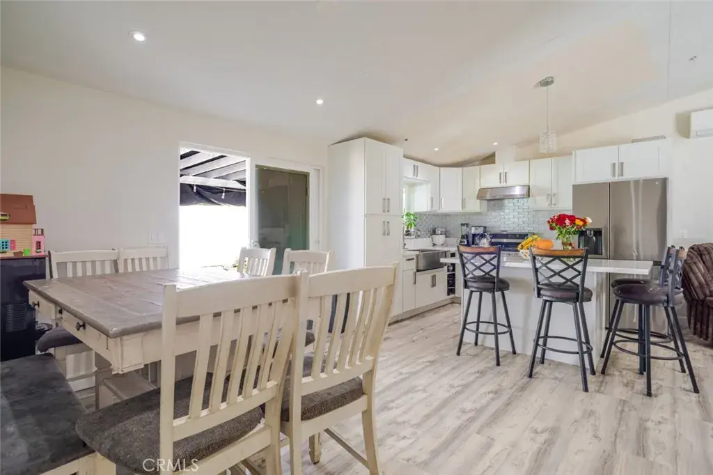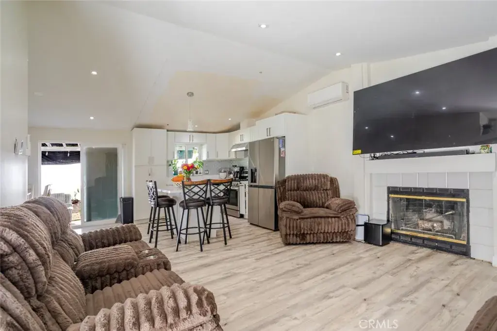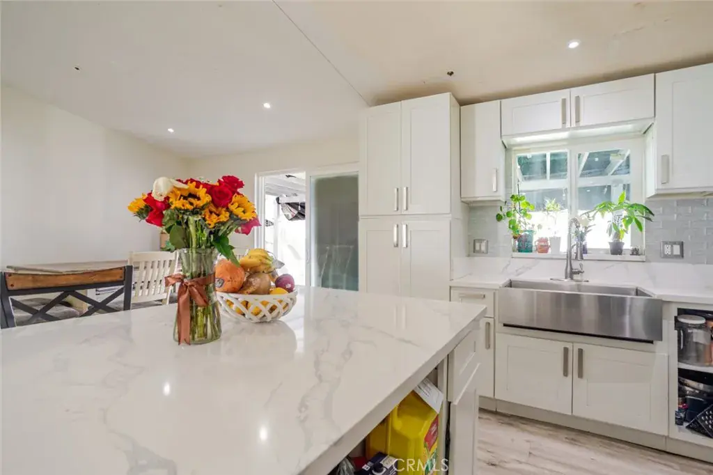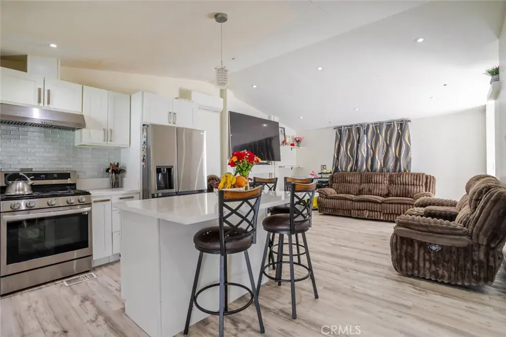 The spacious living room flows seamlessly into the dining area and renovated kitchen, complete with white cabinetry, quartz style countertops, stainless steel appliances, and a large center island with seating. Recessed lighting and updated flooring enhance the modern feel of the home.