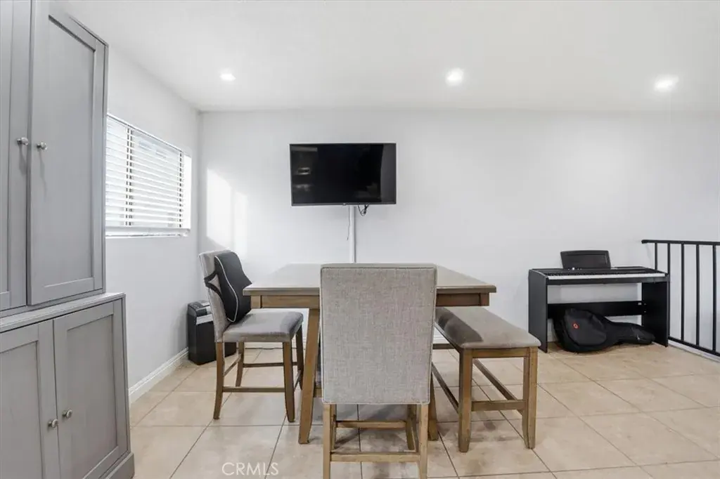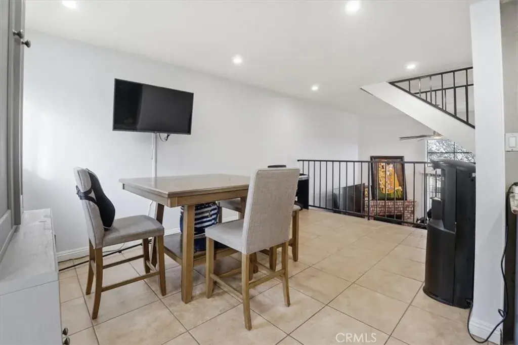 The separate dining area and kitchen are located on the upper level, offering a great space for meals and gatherings. The kitchen features granite countertops, stainless steel dishwasher, ample cabinet space, and tile flooring throughout the main living areas for easy maintenance.