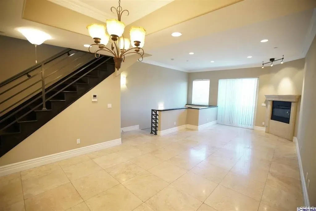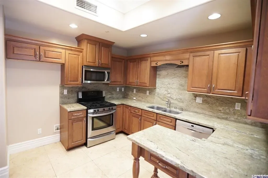 Built in 2009, this luxurious townhome style unit offers it ALL! Step into the split level floor plan with gleaming travertine floors throughout, high ceilings and an open flow living area from the living space to dining area. The balcony off the living room makes ideal for enjoying your morning coffee, or cozy up by the gas-log fireplace. Kitchen boasting granite counters, loads of cabinetry and a stainless steel stove, microwave, dishwasher and refrigerator. Private patio off the kitchen. A half bathroom off the main level makes it ideal for when having guest over. 2 spacious bedrooms, both with attached en-suite baths and the master offering a walk-in closet and private balcony with treetop views. Sky lights on the second level. BONUS Room on the lower level that’s perfect for an office or art studio. Laundry area located in bonus room. Direct access from interior to your private 2 Car Garage. Intercom/Camera Security alarm ready. Conveniently located near all major freeways and just minutes to Ventura Blvd, where you can enjoy dinning, shopping and much more! Photos are not of exact unit, but same layout.