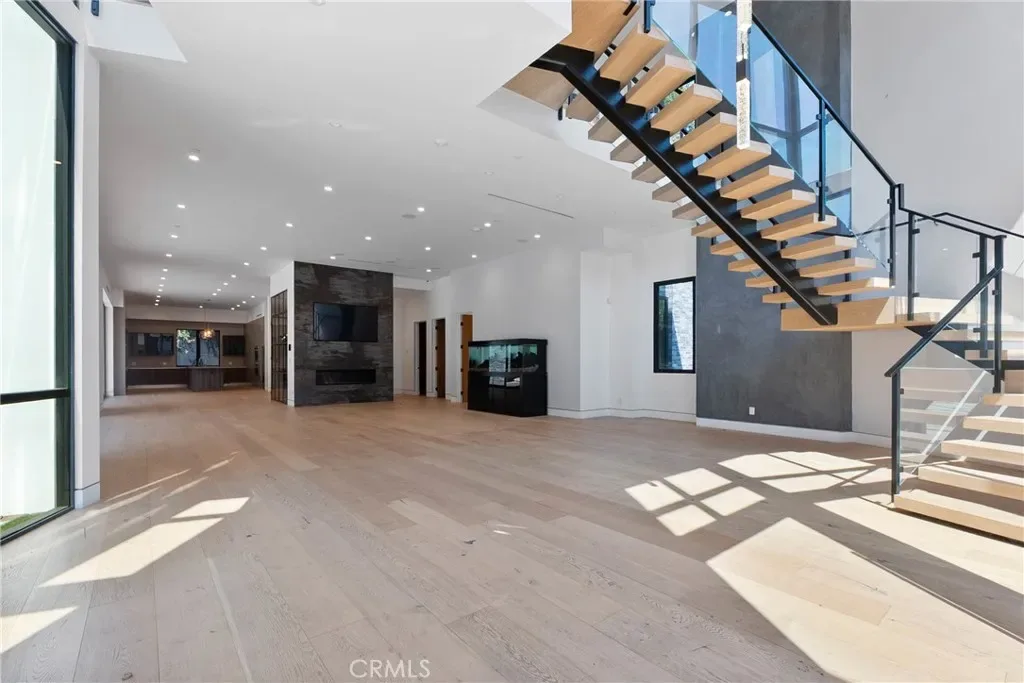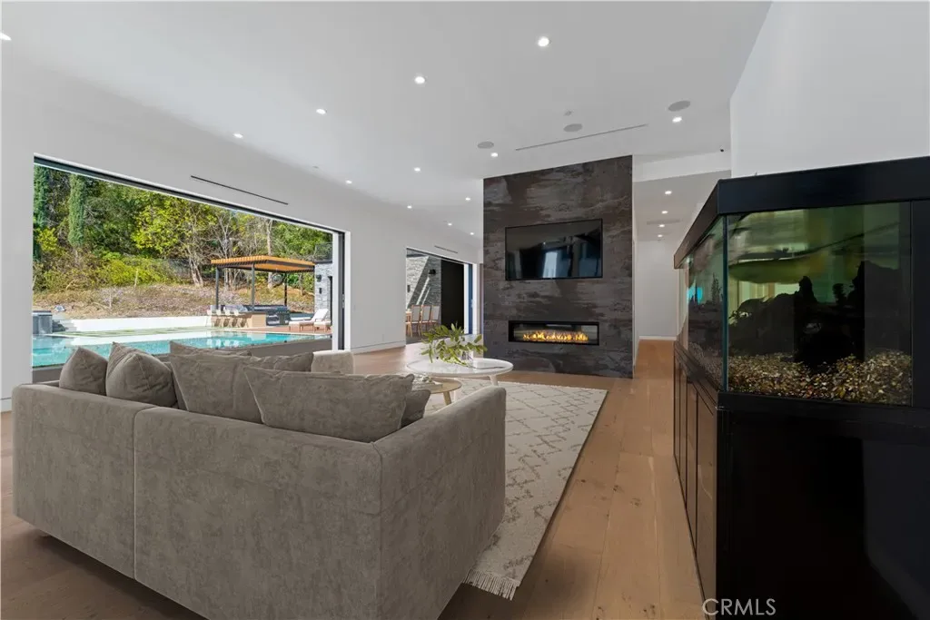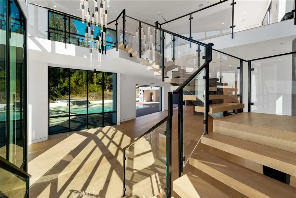 Welcome to your private sanctuary, nestled on a sprawling .68 acre wooded lot. Situated on a flag lot, this estate sits far from the street, ensuring unmatched privacy. A gated entrance and extended driveway lead to a spacious three car garage, with ample additional parking for guests. Step through the breathtaking glass entryway, where soaring 32-foot ceilings, a dramatic chandelier, and striking white oak floating stairs set the stage for this architectural masterpiece. Walls of glass and Fleetwood sliding doors seamlessly blend indoor and outdoor living, flooding the space with natural light and creating an entertainer’s dream. The open concept layout is anchored by stunning oak floors and a sophisticated Italian designed kitchen, featuring a hidden oversized pantry and a wine fridge, perfectly positioned beside an elegant formal dining area. The lower level boasts two ensuite bedrooms, a private office, and a state-of-the-art theater, ensuring ultimate comfort and convenience. Upstairs, the primary suite is a true retreat, complete with a cozy fireplace, a custom walk-in closet, and a spa inspired bath. A private sitting area and relaxation patio offer a peaceful escape. Above the garage, a versatile space awaits, ideal for a gym, studio, or guest quarters, opening onto a spacious outdoor terrace. Step outside into an entertainer’s paradise, featuring a zero edge saltwater pool and spa, a sleek cabana, a fully equipped pool house, and a basketball court. Multiple outdoor patios provide the perfect setting for dining and relaxation, while paid-for solar panels add a modern touch of efficiency. Experience the pinnacle of luxury living, where privacy, elegance, and resort style amenities come together in perfect harmony.