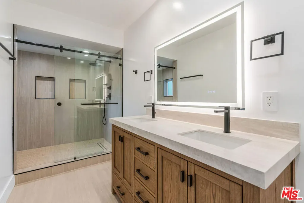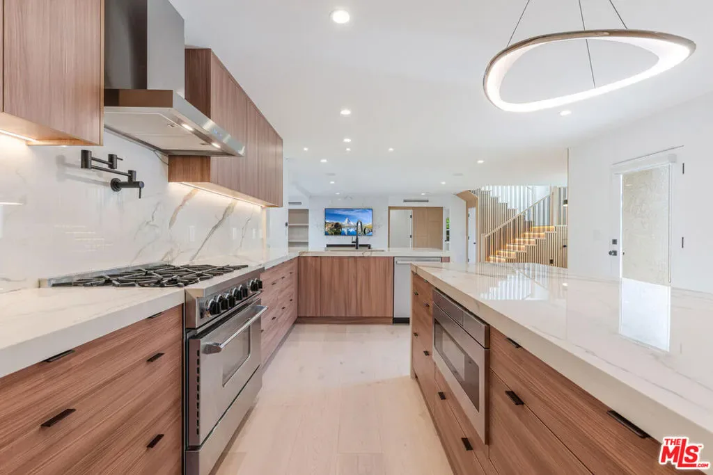 Exquisitely remodeled residence showcasing a sophisticated blend of modern design and timeless comfort. This light-filled home features an expansive open floor plan enhanced by premium finishes throughout, including a designer kitchen with sleek cabinetry, new flooring, spa-inspired bathrooms, and brand-new windows that invite in abundant natural light. Meticulously updated landscaping and top-of-the-line appliances complete this turnkey offering. Thoughtfully designed for both elegance and functionality, the home offers two luxurious primary suites upstairs along with four generously sized bedrooms downstairs ideal for multi-generational living, guests, or private office spaces. The seamless indoor-outdoor flow creates an inviting setting for upscale entertaining and everyday living. Ideally situated within walking distance to shopping, dining, and local amenities, this exceptional home delivers refined living in a highly convenient, family-friendly location.
