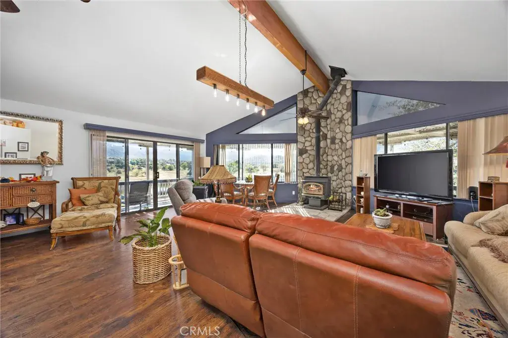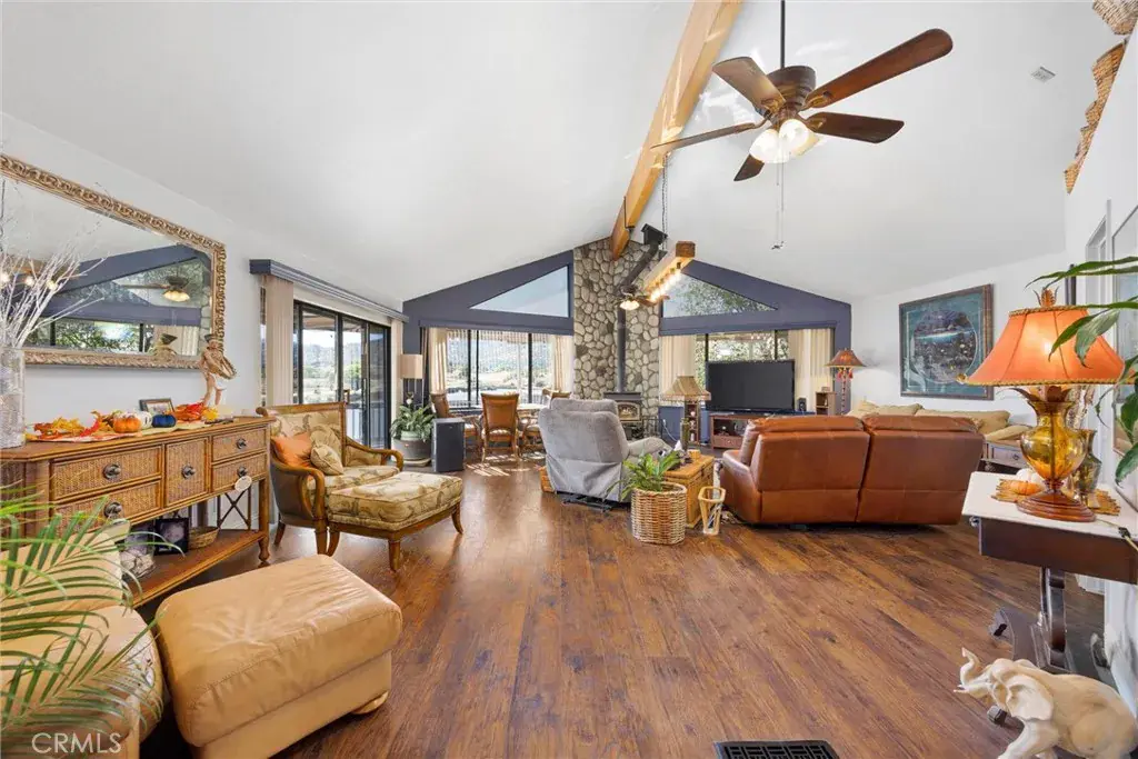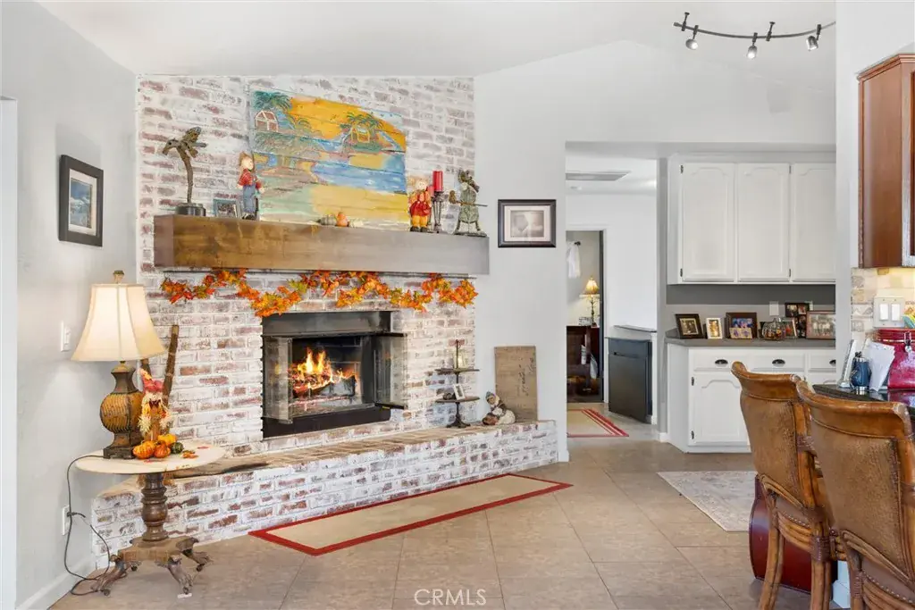 Step inside to an inviting open floor plan featuring a brick fireplace, wood-beam vaulted ceilings, and panoramic lake and mountain views from nearly every room. The updated kitchen showcases granite countertops, stainless steel appliances, and warm wood cabinetry, flowing seamlessly into the living and dining areas designed for entertaining and relaxation.