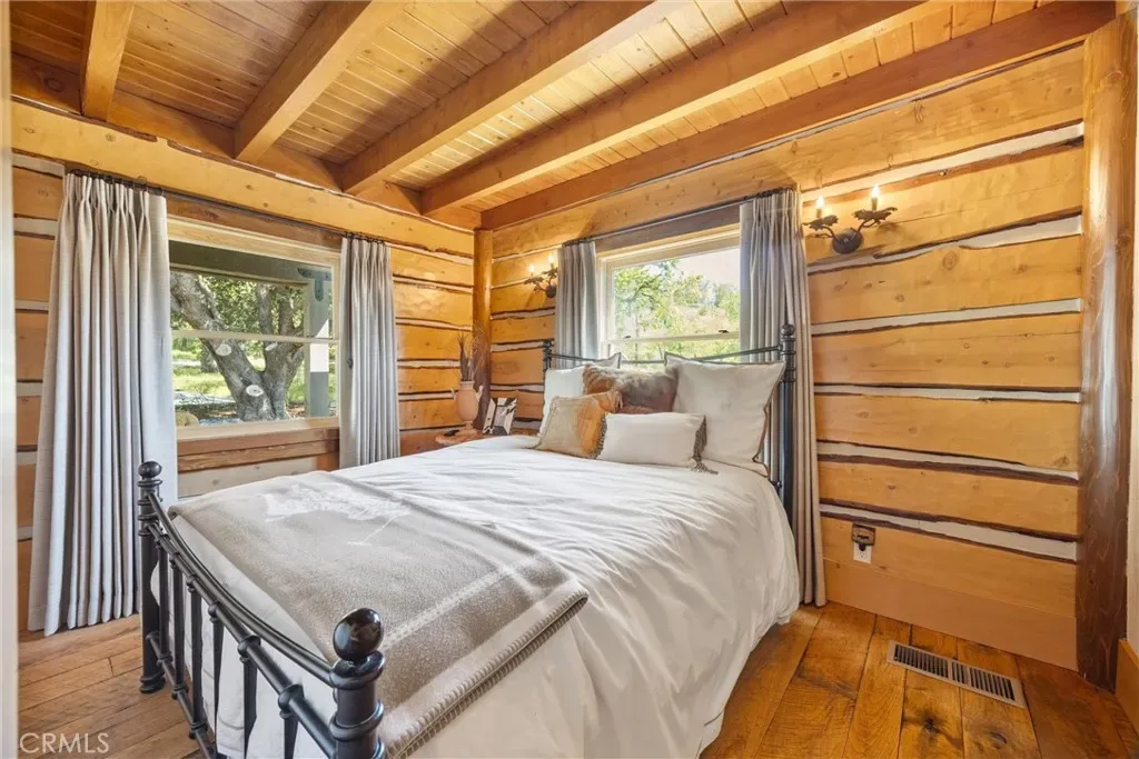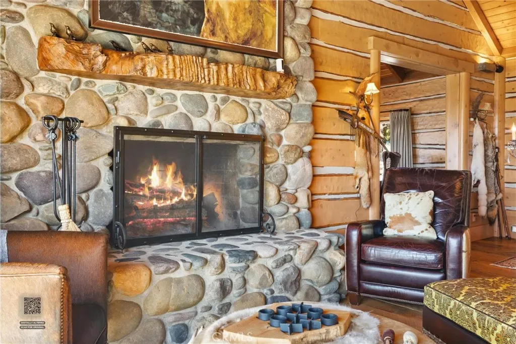 The main residence is a true architectural statement, wrapped in white cedar logs with matching white cedar plank interiors that create a warm yet elevated alpine aesthetic. Richard Marshall hickory flooring grounds the space with timeless elegance, while custom details—including elk shed railings and curated designer fixtures—bring a level of craftsmanship rarely found.