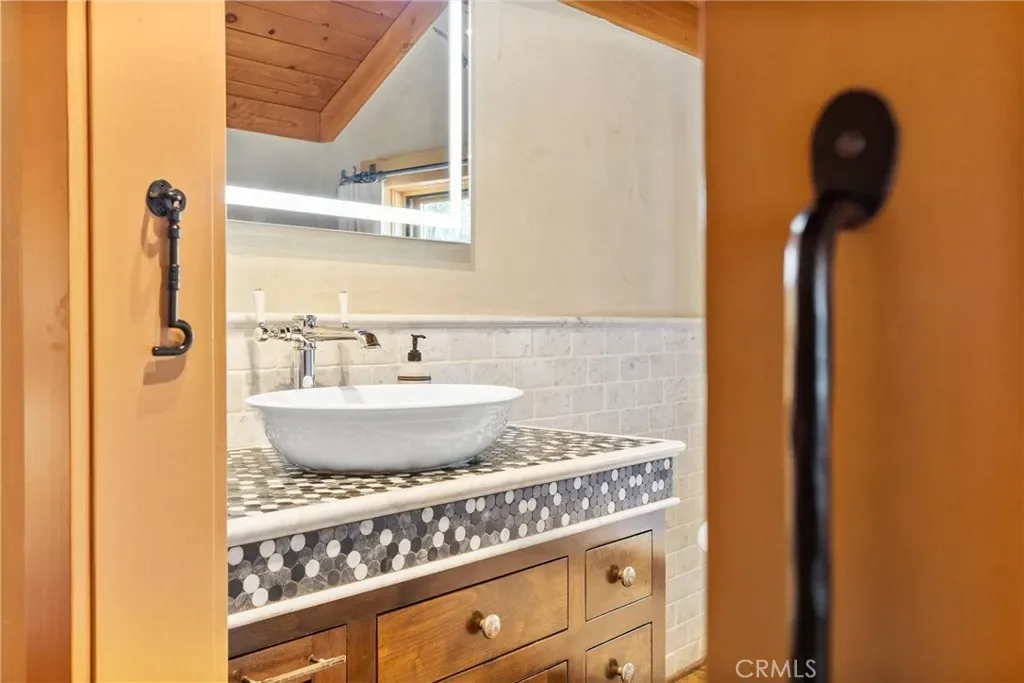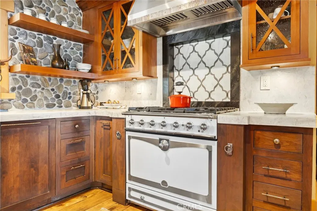 At the heart of the home, the chef’s kitchen is appointed with leathered quartzite countertops and a stunning French oven stove, seamlessly blending old-world charm with modern performance. Expansive windows frame sweeping mountain vistas, creating a seamless connection between indoor and outdoor living.