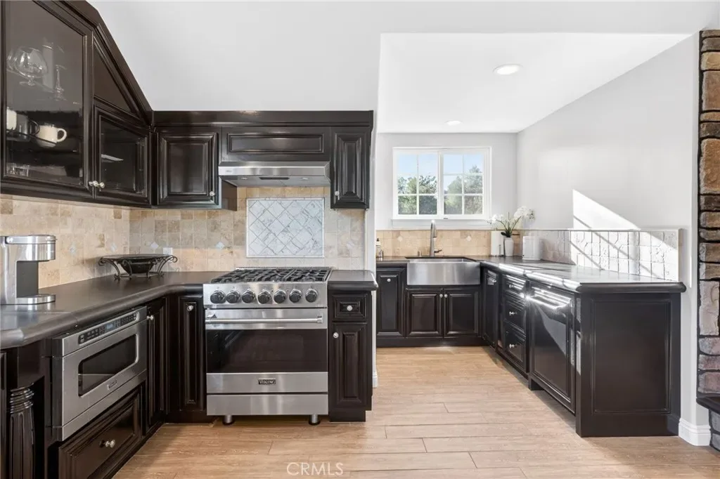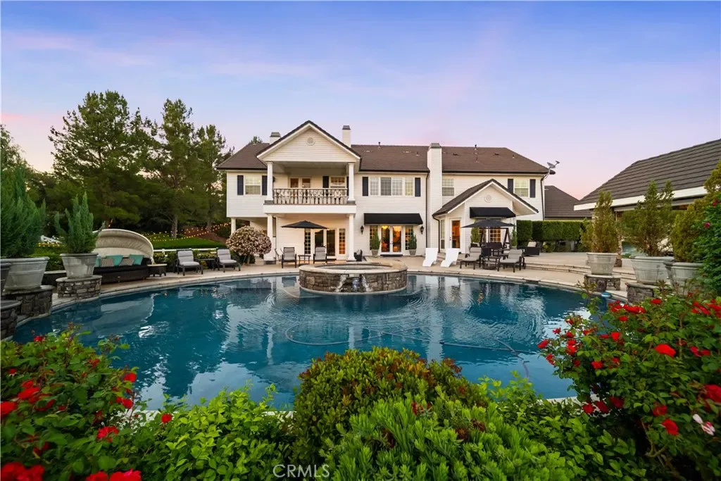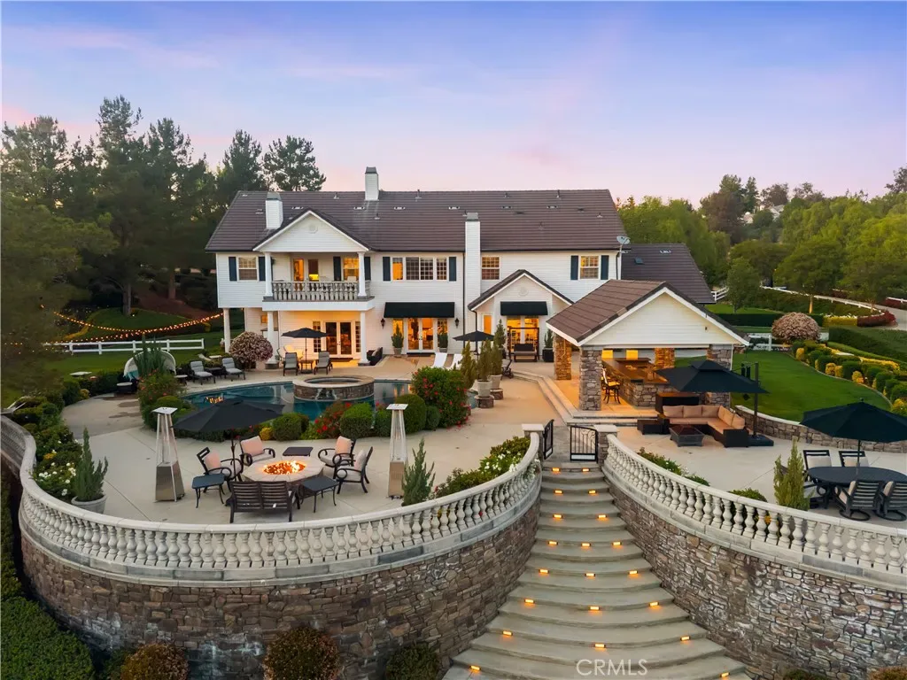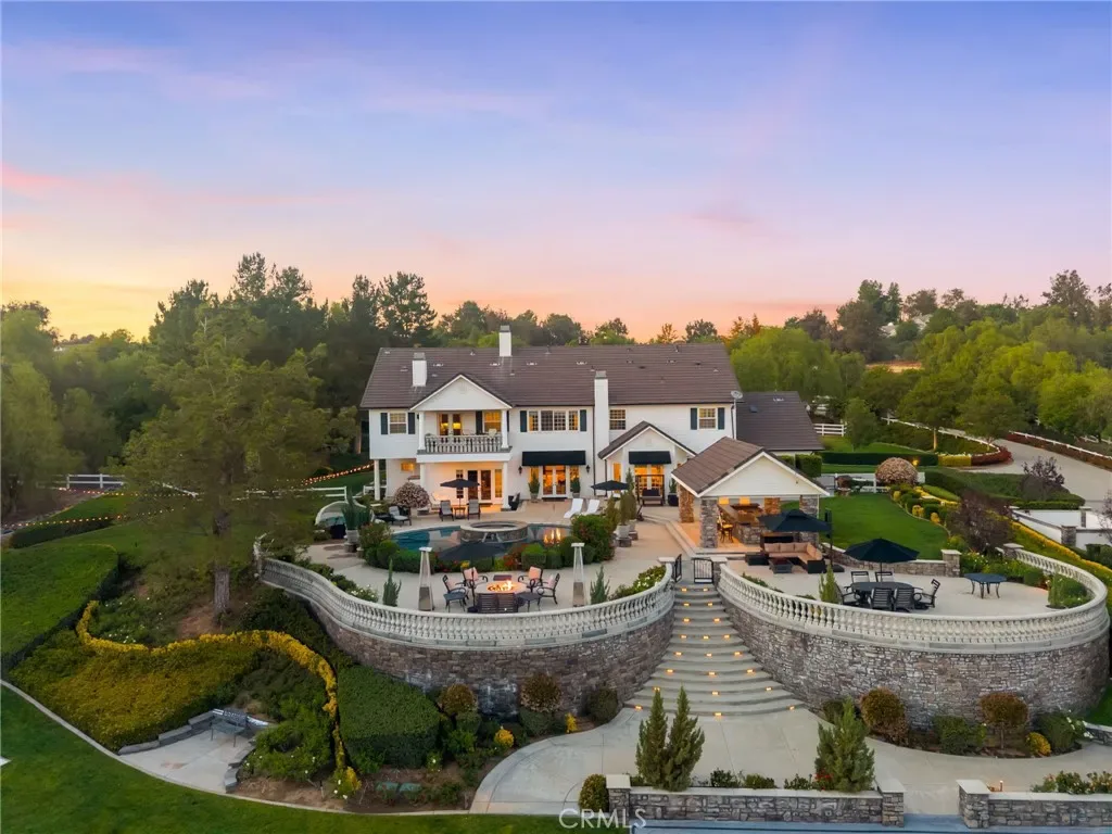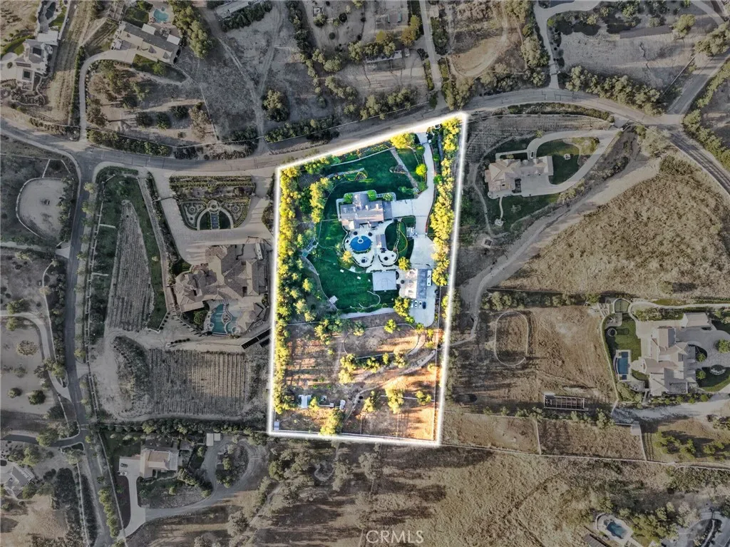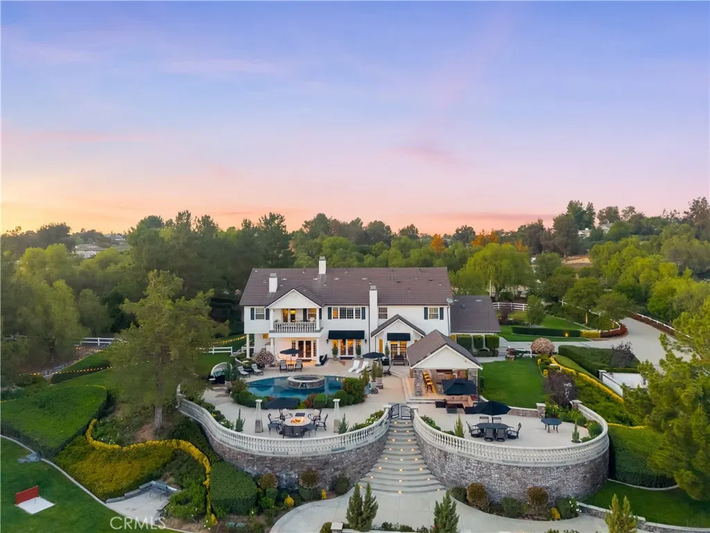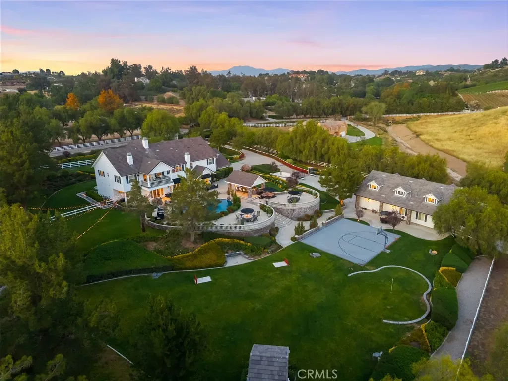 Experience refined country living in this extraordinary luxury estate in Temecula Wine Country, offering approximately 6,887 square feet of thoughtfully crafted living space on five usable acres. The estate features a main home and a guest home with the main home having six spacious bedrooms, including two on the main level, and five and a half bathrooms. The oversized kitchen impresses with a striking large granite island, Thermador double ovens, and a Sub-Zero refrigerator. Hardwood flooring enhances the main living areas, while a carpeted staircase leads to the second level, where hardwood floors continue alongside four additional bedrooms, three bathrooms, a laundry room, and a bonus movie room. Step outside to a true backyard retreat, complete with a resort-style pool and spa, outdoor kitchen, and beautifully landscaped patio. Dramatic, castle-inspired stairways lead to a basketball court, detached garage and pasture with barn and arena. A private ADU guest home sits above the garage, offering a versatile space ideal for guests, extended family, or potential rental income, with convenient RV parking nearby. The expansive, flat acreage also provides ample opportunity for equestrian use or additional outdoor amenities. This exceptional property offers a rare blend of luxury, privacy, and endless potential in one of Southern California’s most desirable settings. For added convenience, RV parking with a dedicated plug is located adjacent to the ADU. This 6 bedroom home is located in Country Road Estates which consists of 128 – 5 acre parcels just on the edge of Temecula Wine Country. The location is super convenient to town and centrally located to some of the best schools Temecula has to offer. Neighboring homes features large acreages, groves and vineyards. Just minutes from highly desirable Linfield Private School and Saint Jeanne De Lestonnac.