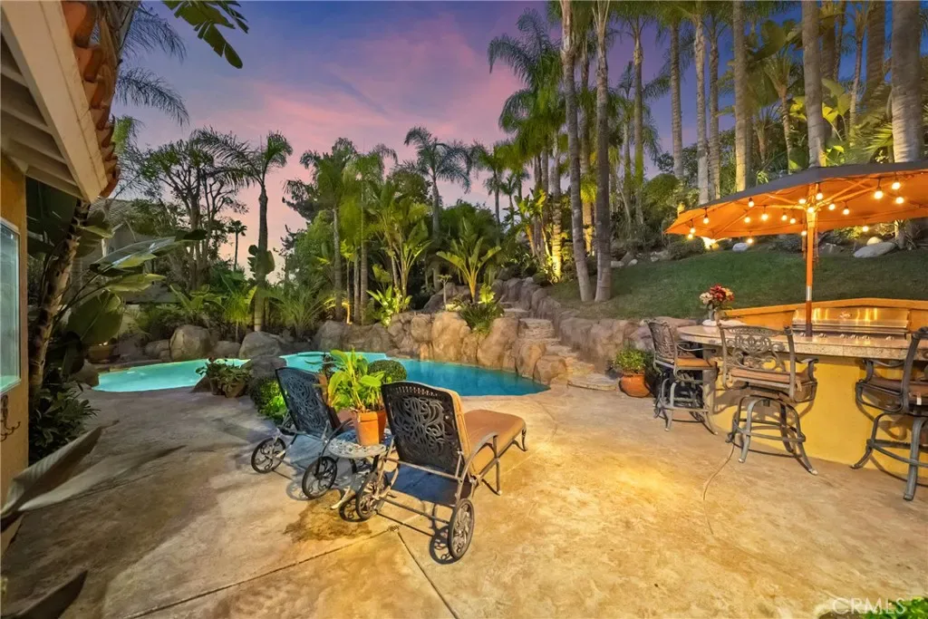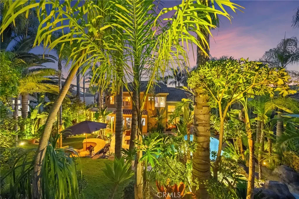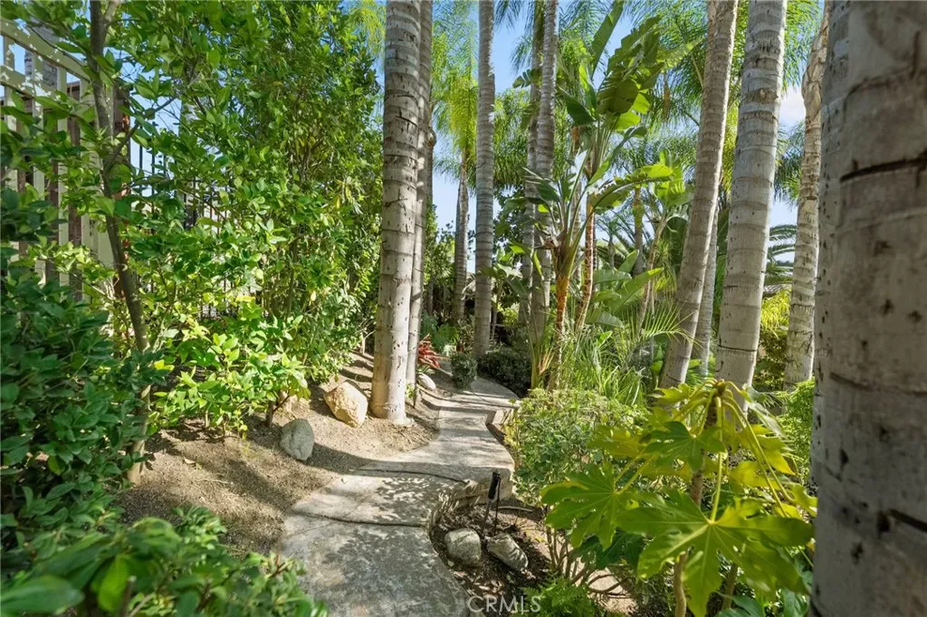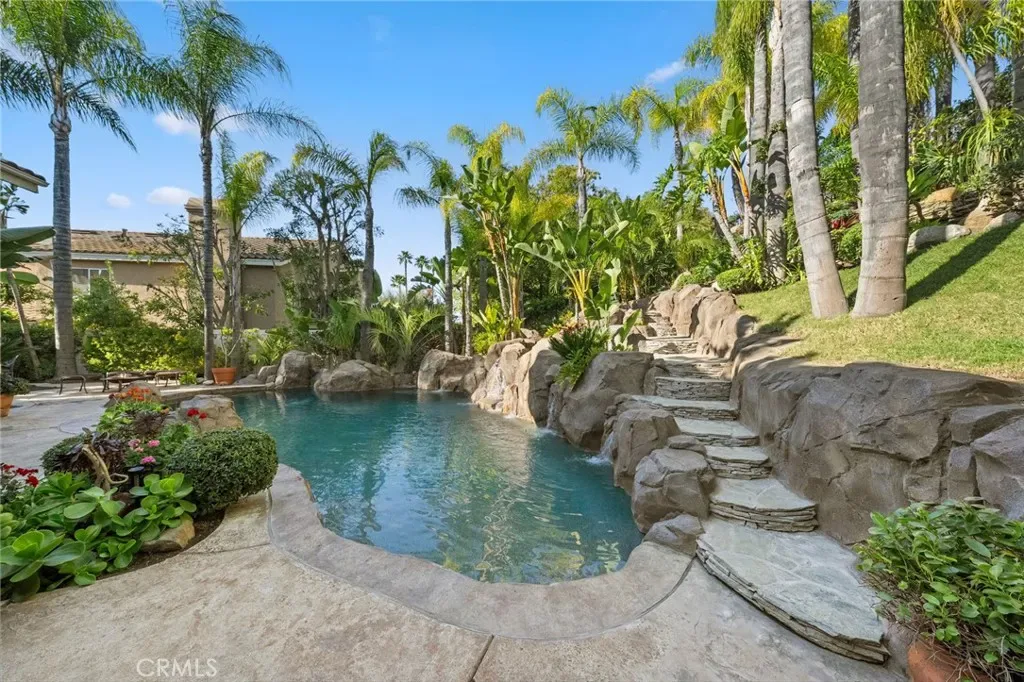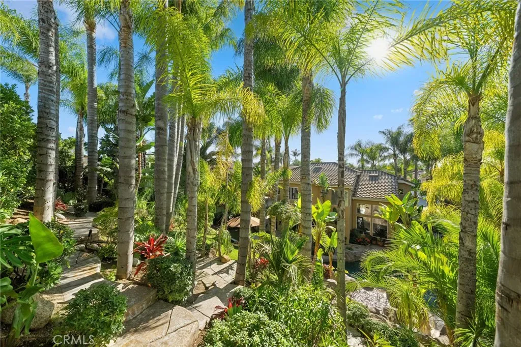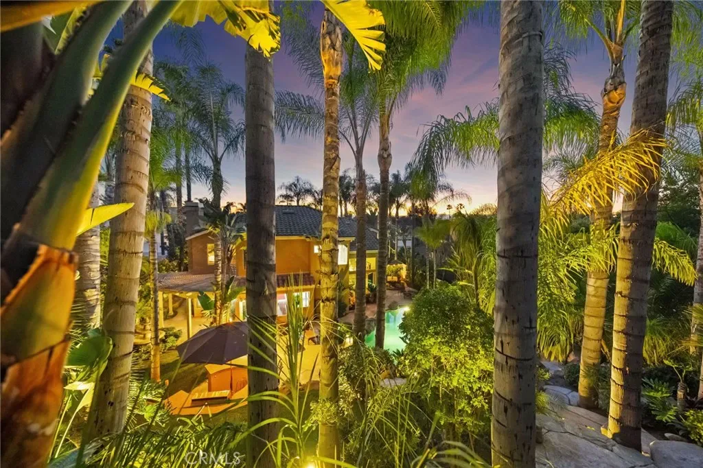 The terraced grounds, masterfully designed and built by Mission Pools, showcase a one-of-a-kind pool and spa framed by over 150 mature palm trees, lush, layered greenery, and 32 strategically placed flood lights that create a stunning evening ambiance. Multiple entertaining zones unfold across three distinct landings, including a built-in BBQ pavilion and a serene koi pond where you can fully immerse yourself in the gardens. A cascading waterfall provides a tranquil soundtrack that can be heard from inside the home, enhancing the seamless connection between indoors and out. Thoughtfully curated and nurtured to maturity, this landscape is not simply maintained – it has been intentionally cultivated.