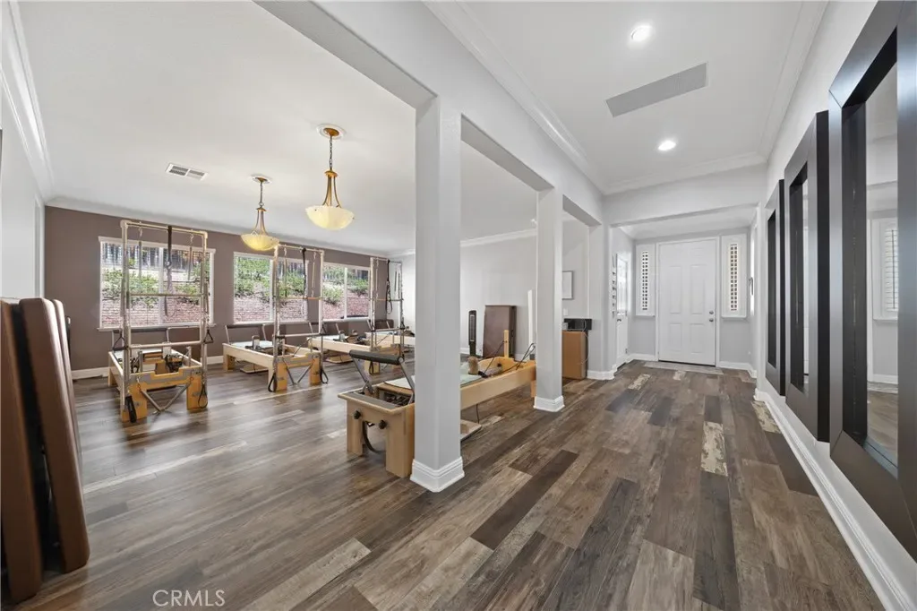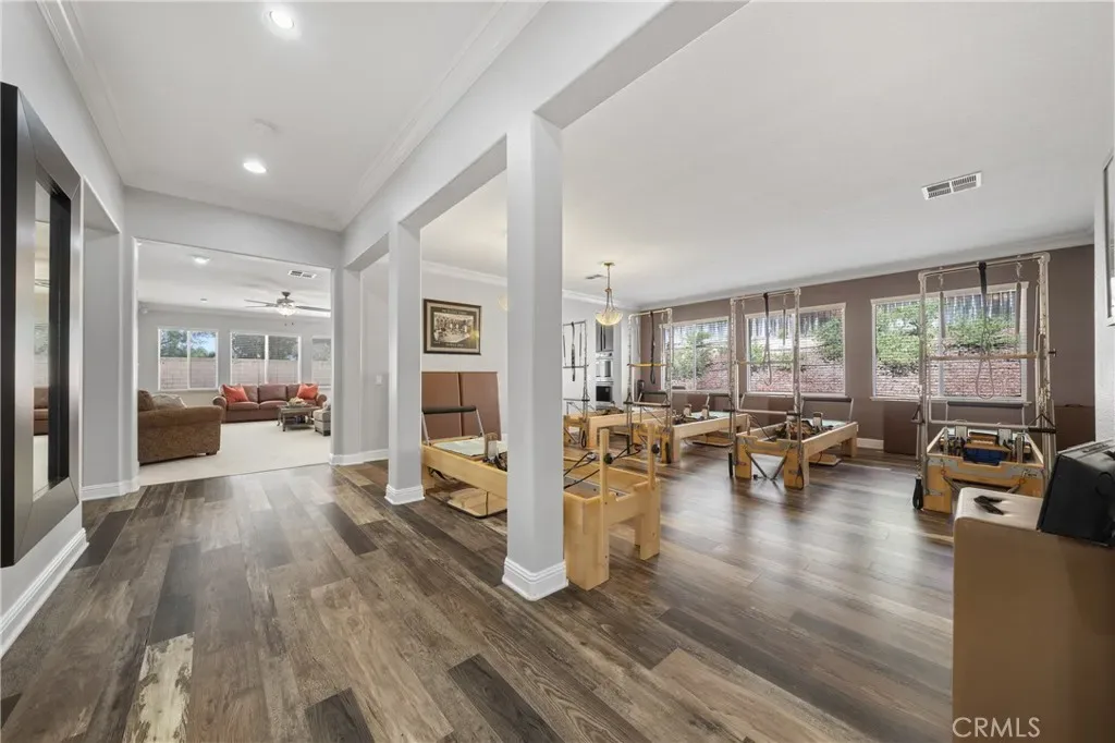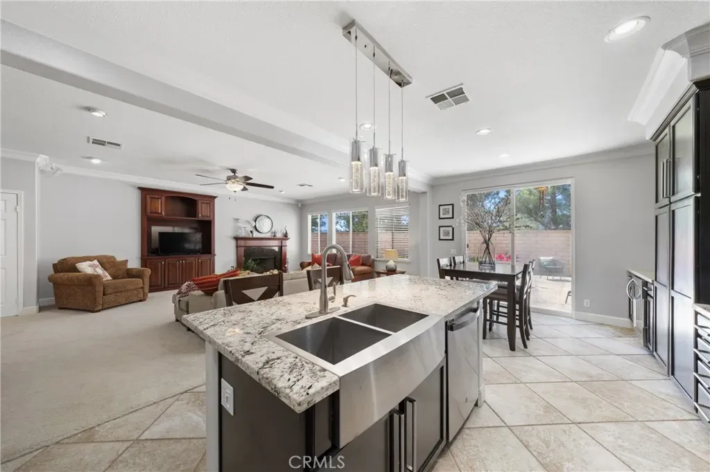 Welcome to your dream home—where style, comfort, and entertaining come together beautifully! This stunning single-story home in Crowne Hill features a show-stopping, fully upgraded kitchen and an open-concept layout designed for effortless living and unforgettable gatherings. At the heart of the home is the entertainer’s dream kitchen, showcasing White Galaxy granite countertops, a spacious island with seating for five, custom cabinetry with elegant rainwater glass doors, and a striking glass subway tile backsplash. Enjoy all-new matching KitchenAid stainless steel appliances, including the refrigerator, along with a gas cooktop, designer stainless hood, double ovens, beverage refrigerator, and champagne-glow pendant lighting that adds the perfect touch of warmth and sophistication. The kitchen flows seamlessly into the inviting family room, complete with a cozy fireplace, built-in media center, and surround sound speakers—ideal for movie nights or hosting guests. In addition, the oversized living room—currently set up as a Pilates studio—offers incredible flexibility and space, making it perfect for large gatherings, celebrations, or whatever fits your lifestyle best. Step outside to your private, low-maintenance backyard oasis featuring a covered lanai, ample patio space for dining and BBQs, and outdoor surround sound to keep the good times going. Throughout the home, you’ll find beautiful travertine tile and neutral carpeting that complement any style. The luxurious primary suite offers a private foyer entry, spa-inspired ensuite with dual sinks, granite countertops, soaking tub, separate shower, dual closets, and a private water closet—your perfect retreat at the end of the day. The thoughtfully designed guest wing includes two bedrooms, a full bath, a built-in office area, and a separate entertainment space—ideal for multigenerational living or visiting guests. Located in the highly desirable Crowne Hill community, this home offers low taxes, a modest HOA, and convenient access to top-rated schools, shopping, dining, Pechanga Resort, and Temecula’s renowned Wine Country. This is more than just a home—it’s a lifestyle upgrade waiting for you to enjoy every single day!