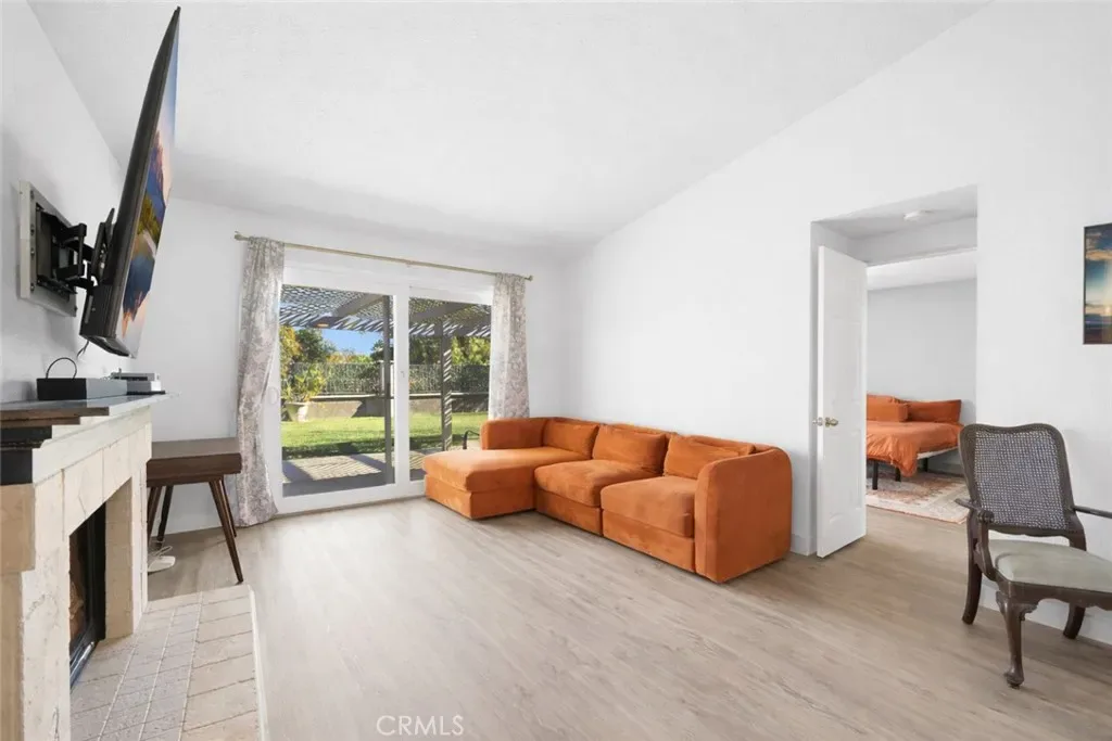 The home offers a warm and inviting layout featuring a spacious living room with a classic brick fireplace and sliding glass doors that open to a tranquil, fully landscaped backyard. Outdoor highlights include fruit trees, and serene mountain views, creating a private retreat for relaxing or entertaining. The kitchen, family, and dining areas are enhanced by light wood flooring, vaulted ceilings, and an abundance of natural light, providing a charming setting for gatherings. The primary bedroom includes dual sinks and a separate storage area for added convenience. Additional features include a two-car garage with a laundry area separated from the main garage space, along with shelving and extra cabinetry for storage. The home sits set back from the street, complemented by a fully landscaped front yard, adding to its curb appeal and privacy.