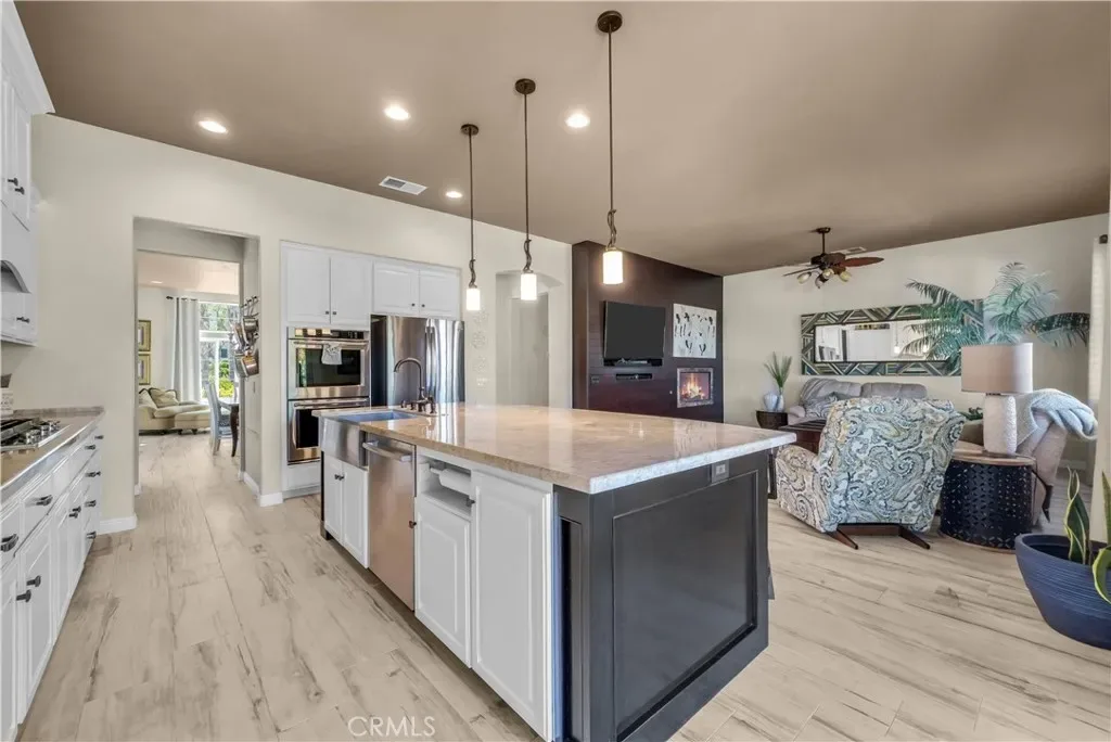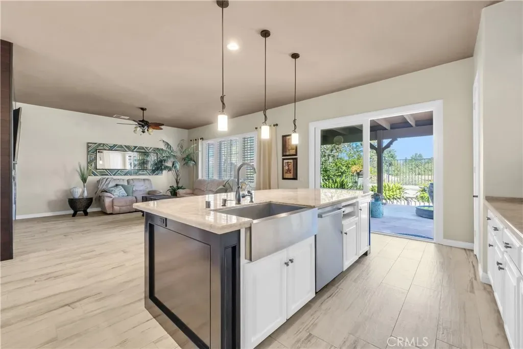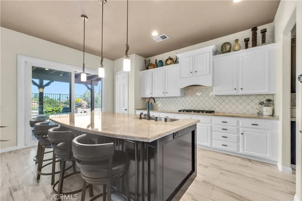 This hard to find single story offers over 2600 sq ft of the ultimate blend of elegance and tranquility. A gorgeous home, with Spectacular Views that sits above the scenic practice putting greens at Redhawk Championship Golf Course. Walk right out your back gate ! The spacious floor plan features 5 bedrooms ( or 4 plus office ) with one bedroom having it’s own private entrance, and a large ensuite with dual sinks, soaking tub, separate shower and walk in closet . An open concept family room and kitchen with upgraded tile, quartzite counters, center island, farm sink, stainless steel KitchenAid double oven, cook top , and a butler’s pantry.