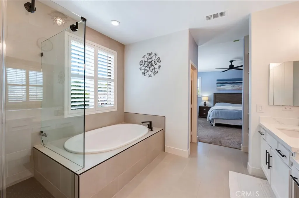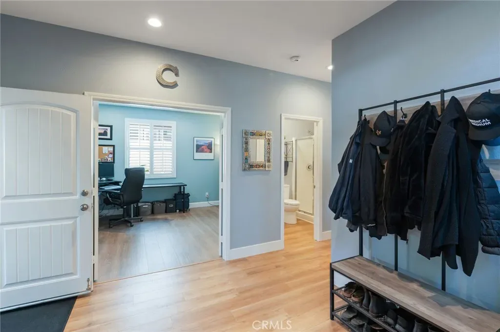 Interior enhancements include new wood laminate, tile, and carpet flooring, added recessed lighting, refinished cabinetry with upgraded countertops and undermount sinks, plantation shutters, coordinated ceiling fans, custom closets in every bedroom, updated bathroom tile, a custom linen cabinet in the primary suite, and a custom barn door at the laundry room. Additional improvements include upgraded switches and outlets, overhead garage storage, plus a newer A/C system and water heater.