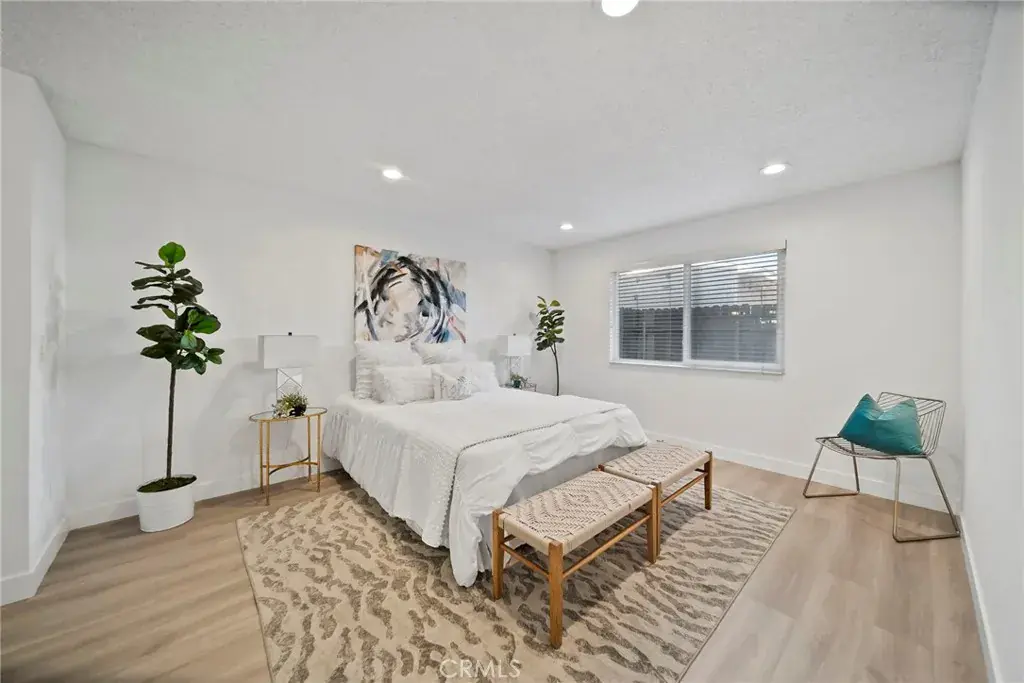 Bright interior with recessed lighting and new flooring throughout. Living room opens to a spacious private side yard, ideal for relaxing or outdoor use. Kitchen and bathrooms feature granite countertops, and laundry hookups are inside the unit.
