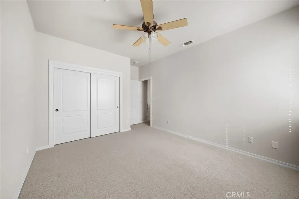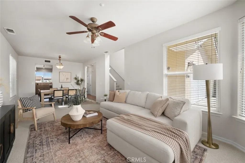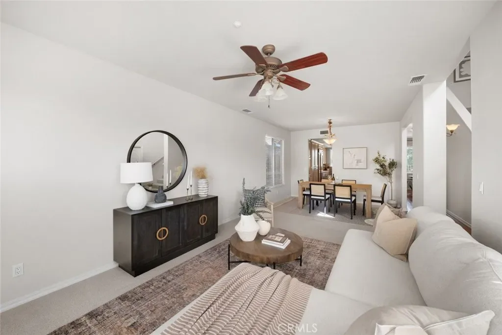 The home opens up to a generously sized kitchen with ample counter space and storage, perfectly positioned to connect with the main living area. Just beyond, the family room offers a comfortable setting with a cozy gas fireplace and direct access to the backyard, where you’ll enjoy peaceful views of the surrounding hills.