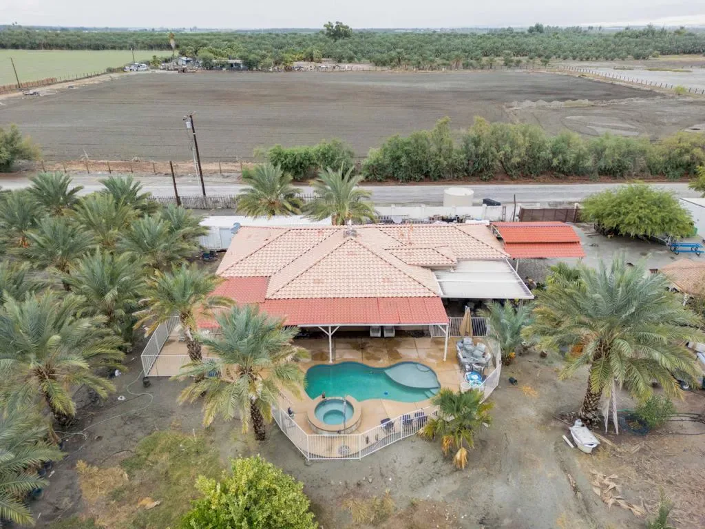 Discover a truly exceptional 10.23-acre horse property ranch, perfectly situated on a prime corner lot at Harrison St. and 61st Ave. This rare offering combines modern living, agricultural opportunity, and incredible event-ready amenities–all in one stunning setting.Built in 2017, the custom home features 3 spacious bedrooms and 2 beautifully appointed bathrooms. Inside, you’ll find elegant wood-like flooring throughout, giving the home a warm and inviting feel. The kitchen showcases rich granite countertops, which are also matched in both bathrooms, emphasizing the quality craftsmanship found throughout the home. Step outside and enjoy your own private oasis: a gated pool and jacuzzi, complete with a covered patio that offers serene views of the surrounding palm trees and mountain backdrop–the perfect spot to unwind or entertain guests.In addition to the main home, the property includes a 2-car garage and two detached bathrooms, ideal for hosting gatherings. And this ranch is truly designed for celebrations of all kinds–whether weddings, quinceaneras, family events, or weekend get-togethers, there’s a dedicated event area ready for use. A beautifully built gazebo sits perfectly positioned to overlook the entire ranch, offering peaceful views of the land and its towering palms.Agricultural lovers will appreciate the 600+ producing date palm trees featuring multiple varieties. With a packing room, bands, and a cold storage unit, this property is fully equipped for production. Water access is abundant with both canal water and a private well, supporting farming, ranching, and livestock.Whether you’re dreaming of a full-scale ranch, an income-producing agricultural operation, an event venue, or simply a private retreat, this property delivers unmatched potential. Plenty of space allows for horses, chickens, goats, pigs, and more–you name it, this ranch can accommodate it.This is the unique opportunity you’ve been waiting for. Schedule your private showing today and experience all that this incredible ranch has to offer.