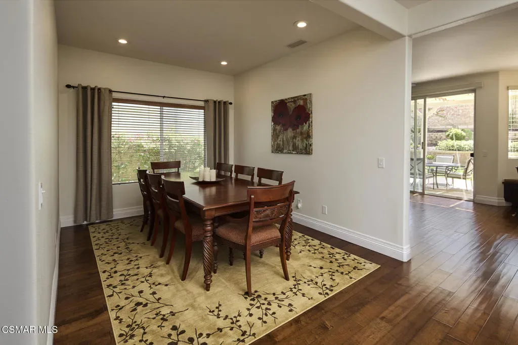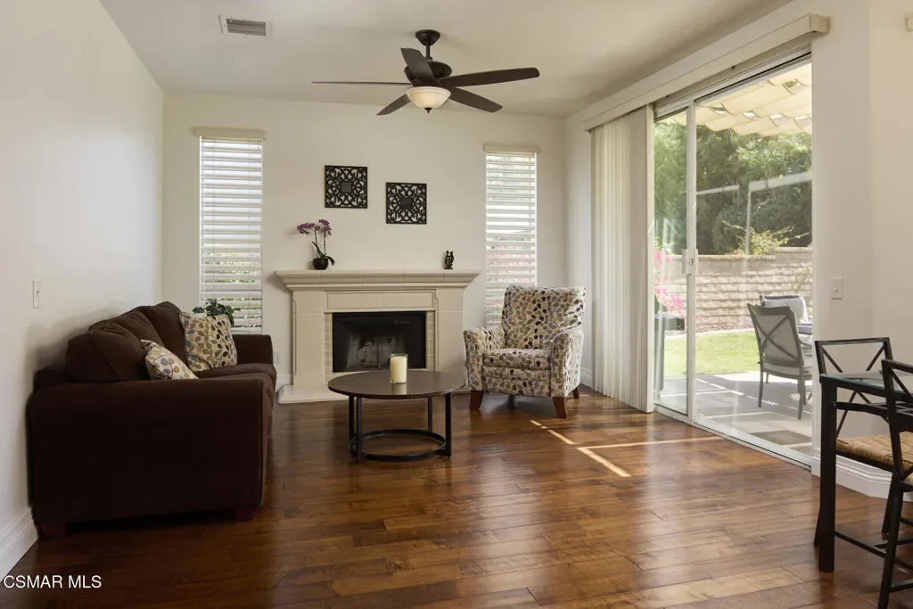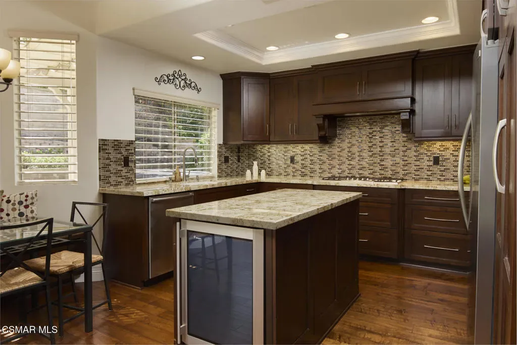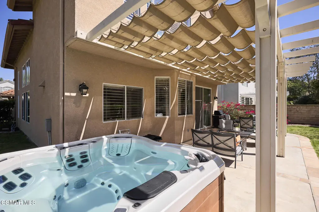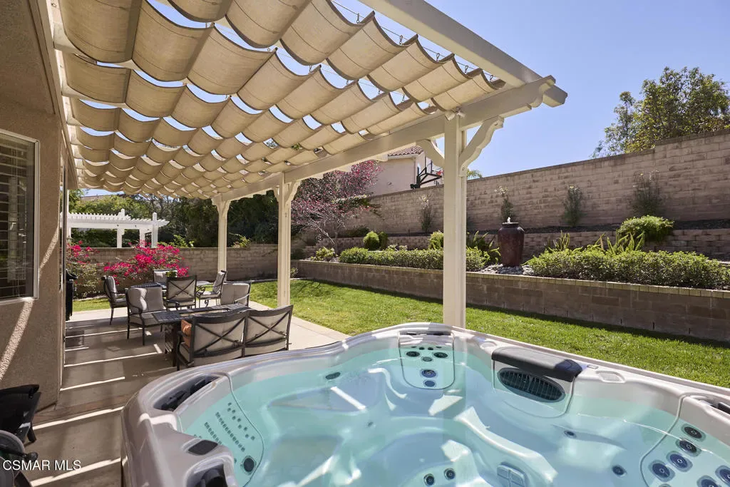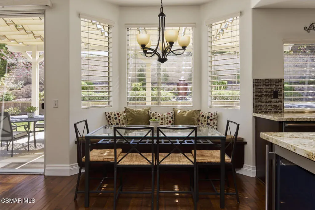 Wow! What a gorgeous home! Finally, a turnkey Rancho Conejo 5 bedroom home with a great yard! Welcome to 1804 Golden Oak, a short and quiet street in 24 hour guarded Rancho Conejo. With breathtaking hardwood (not LVP) flooring, a stunningly remodeled kitchen featuring rich mahogany stained cabinets, square edged granite with glass backsplash, a full complement of deep drawers, stainless steel appliances including both a side by side and wine fridge! The built in bay window seated breakfast nook is sublime and a place you will thoroughly relish every mealtime. The collection of gorgeous contemporary window coverings are super cool too. The family room has a beautiful wood burning fireplace and 8′ sliding glass door which leads to a spacious patio and retractable cable shade cover. There’s even an above ground spa for fun relaxation. The grassy yard is Uniquely roomy for the neighborhood and it’s super private! The first floor rounds out with a living room, dining room and a very sharp iron and wood staircase. There’s a full bath down for guests and the downstairs bedroom. Indoor laundry and a 3 car garage are also accessible on the ground level. Upstairs you’ll find 4 more bedrooms including a large, elegant primary suite with plantation shutters. Rancho Conejo is a 24 hour guard gated community with roving patrol, 2 pools and 2 spas, dog friendly pedestrian paseos, close to shopping, the Oaks Mall, Los Robles Regional Medical Center, Rancho Conejo Playfield with the most fun and competitive pickleball courts, and great schools. Hiking trails are close and accessible from both the front and rear gates and the dues are a truly ridiculous $163/mo!