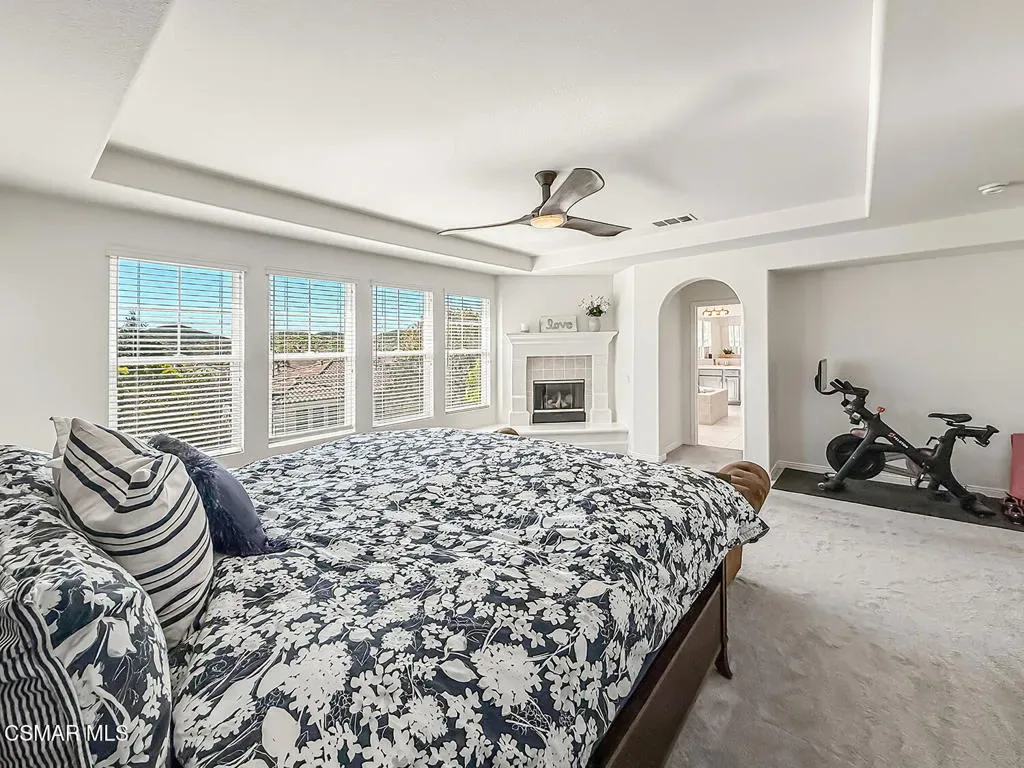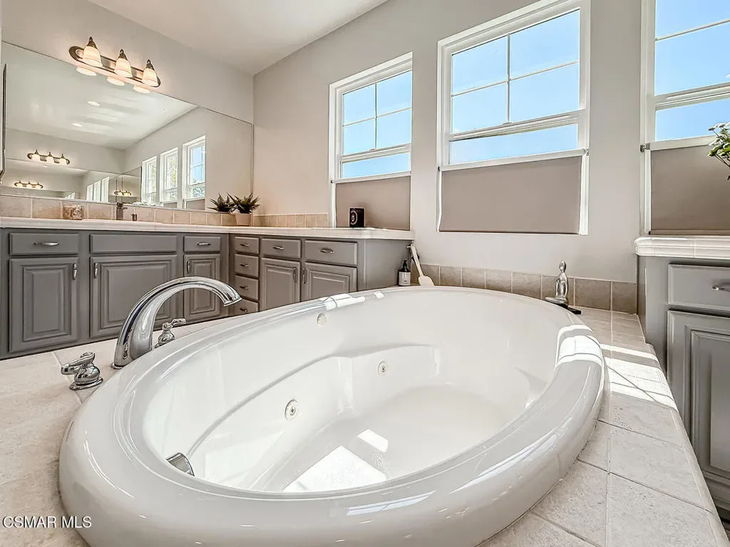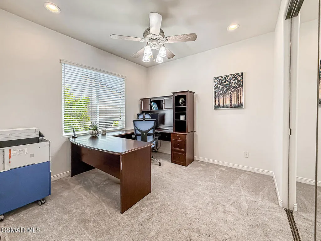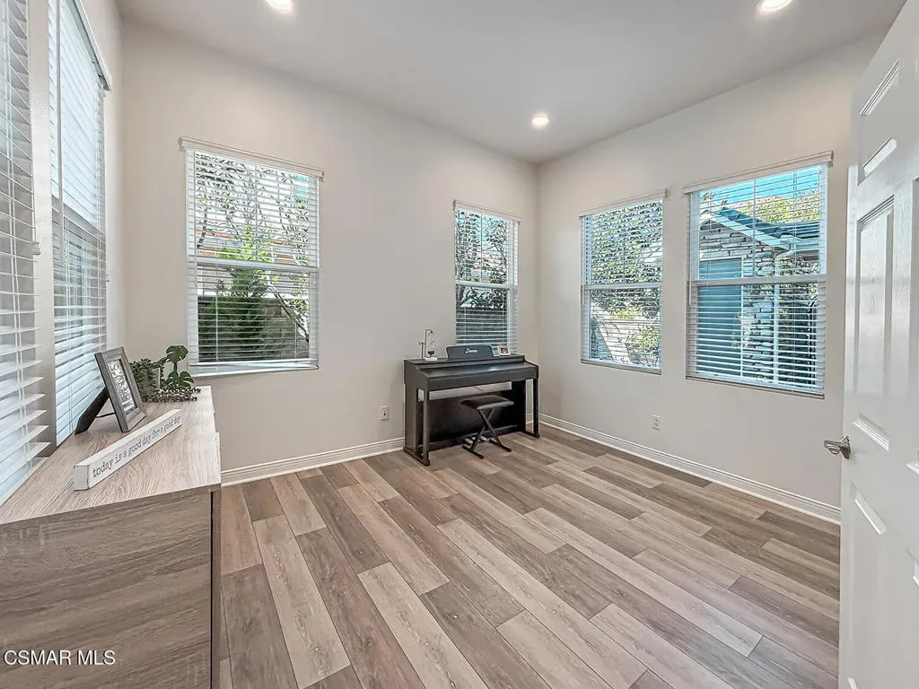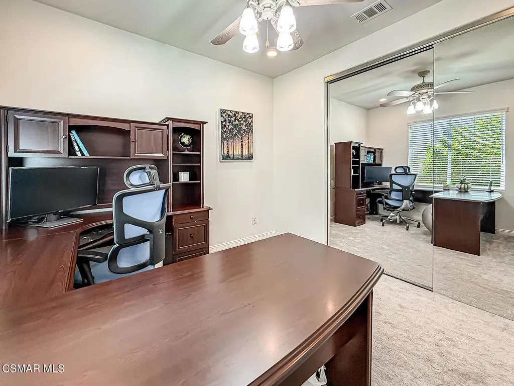 Experience refined living in this stunning Dos Vientos Ranch Concerto home, where grand architecture, private outdoor spaces, and breathtaking sunset views create the perfect blend of luxury and comfort. Crafted by Trimark Pacific, this exceptional residence showcases elevated architecture, soaring ceilings, expansive archways, and impeccable craftsmanship throughout.Guests are welcomed by a private gated courtyard, creating a warm and elegant arrival to this impressive 4,124 sq ft residence–the largest floor plan in the collection. Thoughtfully designed, the home offers 5 bedrooms, 4.5 bathrooms, a spacious loft, and an additional enclosed den/bonus room just off the entry, ideal for a home office, study area, music room, or quiet reading retreat. The main level also features a private en-suite bedroom with full bath plus a powder room, ideal for guests or multi-generational living.At the heart of the home, the expansive family room underwent a 2018 renovation, centering the gas fireplace and enhancing the space with warm and neutral stacked stone, along with custom built-in cabinetry and shelving for both beauty and function. The family room flows effortlessly into a beautifully appointed chef’s kitchen designed for everyday living and entertaining. Enjoy lovely poolside views, newer appliances including a Sub-Zero refrigerator and Wolf double-oven range with microwave, all replaced in 2021, spacious pantry, plenty of counter space, large eating area with room for large table, along with freshly painted cabinetry and updated pendant lighting. Just off the kitchen, a generous dining room offers the perfect setting for gatherings and features an updated chandelier.French doors off the downstairs hall open to a spacious side patio ready for your vision. The low-maintenance rear yard sits just off the family room and kitchen and features a beautiful pool, spa, fire pit, and pergola for shade. This inviting backyard retreat offers a serene setting to unwind while enjoying the tranquil sounds of the pool’s water features.Upstairs, the primary suite captures breathtaking sunset and mountain views and includes a cozy fireplace for relaxing at the end of the day. The primary bath offers a Jacuzzi tub, oversized shower, dual vanities, dual walk-in closets, and abundant cabinetry–all along side the stunning views. Down the hall are two additional spacious bedrooms sharing a bath with dual sinks and tub/shower, plus a conveniently located laundry room nearby.At the center of the second floor is a large loft area, perfect for games, movies, homework, or entertaining. Completing the upstairs is the 5th bedroom with its own en-suite bath, rounding out this luxurious and highly functional floor plan.Additional highlights include a 3-car garage, newer downstairs flooring and upstairs carpet, updated tile flooring in all bathrooms, updated lighting fixtures and ceiling fans (except one), and neutral white blinds throughout. Exterior improvements include fire-resistant hardscape landscaping, a largely upgraded eco-friendly drip irrigation system, and recently power-washed stone surfaces.Practical upgrades include a generator outlet for backup power, attic fan and whole-house fan for improved airflow and energy efficiency, and an updated washer and dryer (2024). These thoughtful improvements help reduce cooling costs while enhancing year-round comfort.A rare opportunity to enjoy luxury, function, and spectacular views in one of Dos Vientos Ranch’s most desirable homes!