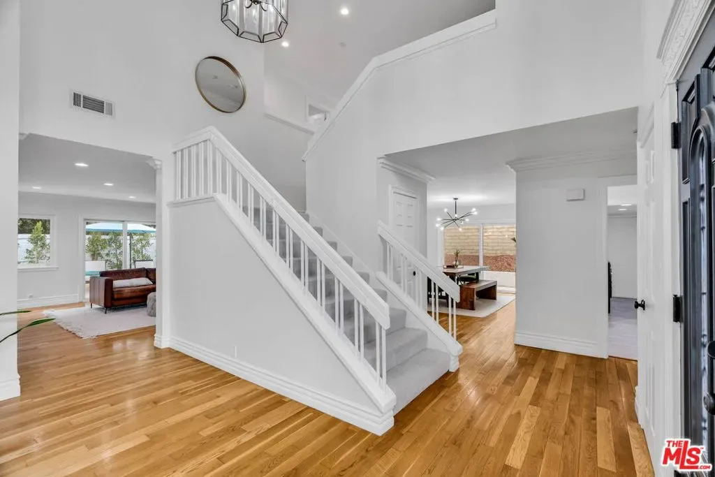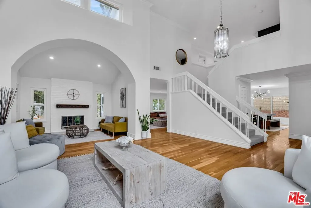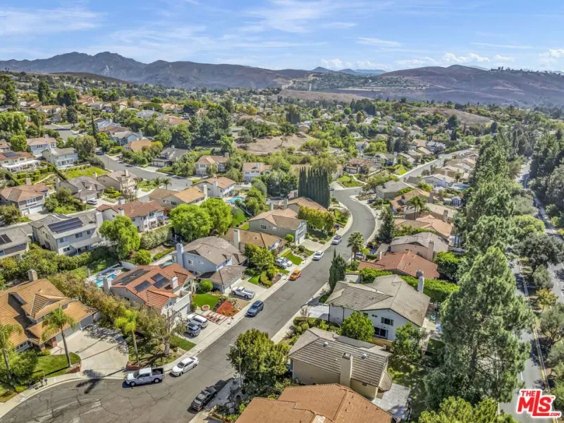 Welcome to this beautifully updated 4-bedroom, 2.5-bath home tucked away in a desirable pocket of Thousand Oaks! Move-in ready and offering the perfect blend of style, comfort, and functionality. Step into the living room with vaulted ceilings and abundant natural light! Just beyond is a cozy den featuring a charming fireplace. The family room flows seamlessly into the open, modern kitchen, complete with a center island, quartz countertops, premium built-in Thermador appliances, and custom cabinetry! A formal dining room, guest bath, and laundry room complete the main level. Upstairs, a loft-style foyer provides flexible space for work, play, or relaxation. The primary suite features LVP flooring, a spa-inspired bathroom with dual sink vanities, a soaking tub, glass-enclosed shower, separate vanity area, and a walk-in closet. Three additional bedrooms offer peaceful views of mature trees. The spacious garage includes a converted third bay–an approx. 190 sq ft temperature-controlled bonus flex room perfect for a gym, office or storage space. Additional highlights include: hardwood flooring throughout the main level, recessed lighting, custom roller shades, a Nest thermostat, neutral interior finishes, a serene enclosed front patio and a private, low-maintenance backyard perfect for pets, entertaining, or relaxing! Located on a quiet cul-de-sac just minutes from award-winning Lang Ranch Elementary, parks, hiking trails, shopping, dining, and the 23 freeway. Over 3,200 sq ft of usable living space with no HOA!