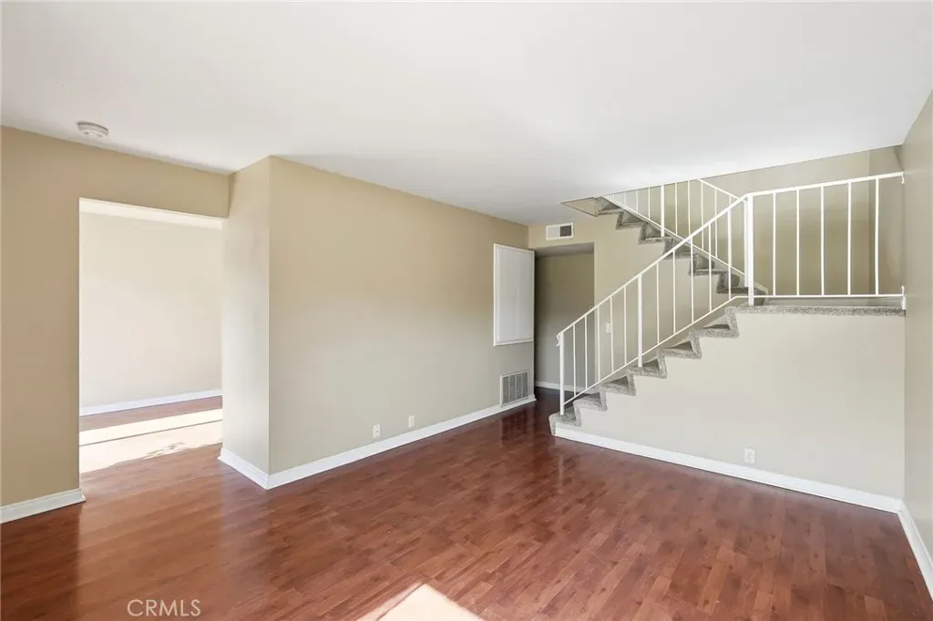 The main level features a bright living area filled with natural light, wood-style flooring, and an open flow into the kitchen and dining area — ideal for everyday living and entertaining. A large private patio extends the living space outdoors, perfect for relaxing or hosting guests.