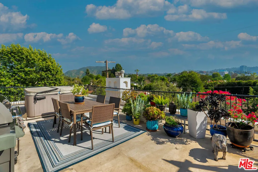 Luxurious townhome with an expansive private rooftop deck, ideally situated in prestigious Toluca Lake. This exceptional 3-bedroom, 3.5-bath residence welcomes you with a bright, open floor plan enhanced by modern designer finishes throughout. A dramatic two-story marble foyer with ornamental wrought iron detailing sets the tone, leading into an elegant layout designed for both everyday living and effortless entertaining. Rich cherry wood floors run throughout, while abundant windows fill the home with natural light.The formal living room is anchored by a beautiful fireplace and flows seamlessly into the adjoining dining room, complete with a sleek wet bar. The crisp white chef’s kitchen features quartz countertops, breakfast bar, a Sub-Zero refrigerator, and a separate eating area. Upstairs, the stunning primary suite serves as a true cozy retreat, an oversized walk-in closet, a private balcony with views, and a large spa-inspired bathroom with a jetted soaking tub. A secondary bedroom suite is also located on this level, providing comfort and privacy. On the first floor, an additional bedroom suite offers ideal flexibility, perfect for guests, an executive home office, or private workspace. At the top, the show-stopping private rooftop deck captures the essence of Southern California living featuring a hot tub, dedicated dining and lounge areas, and a gas hookup for BBQ. Enjoy unobstructed sunrise views behind Griffith Park, Holidays watch parties of Universal Studios and WB Studios fireworks, creating a dynamic backdrop perfect for year-round entertaining.Additional highlights include a private two-car garage and a convenient dumbwaiter. Ideally located near major motion picture studios, shopping, dining, and all that Toluca Lake has to offer.