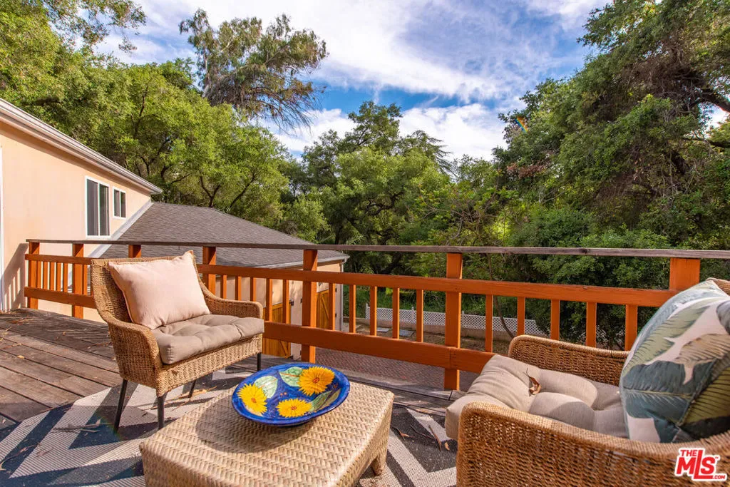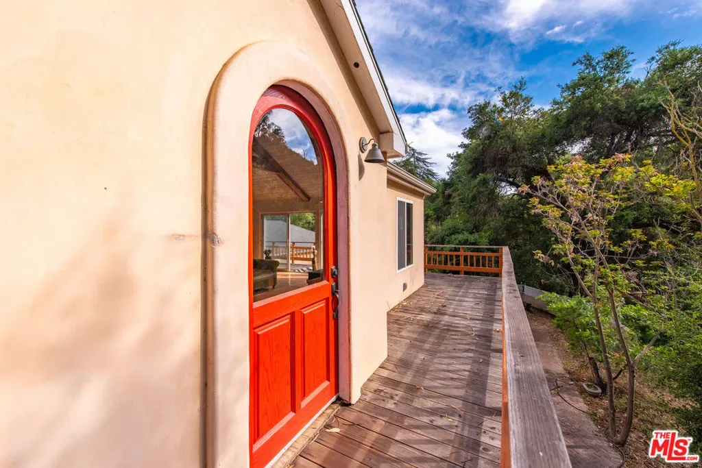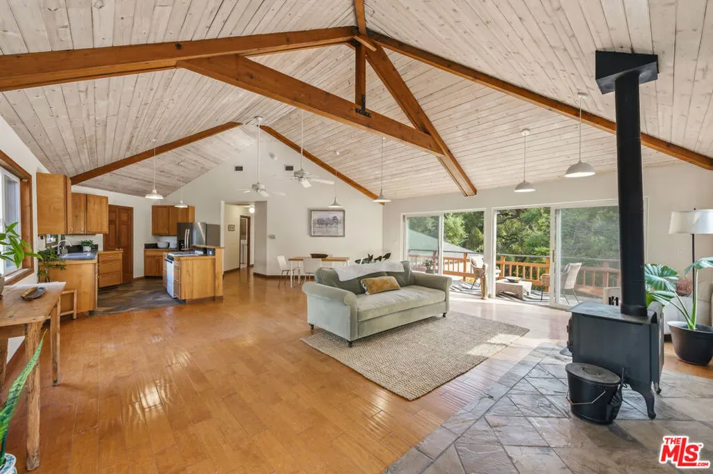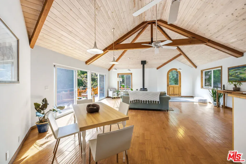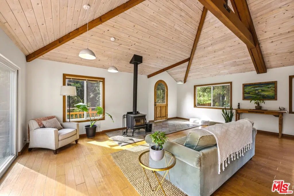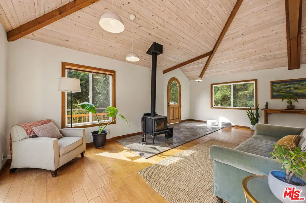Discover your dream retreat in this delightful chalet featuring 2 cozy bedrooms and a full bath. The soaring vaulted ceilings and expansive windows create a light-filled ambiance, perfect for relaxation. Enjoy the warmth of the wood-burning fireplace while admiring the beautiful hardwood floors throughout. Step outside to the wrap-around deck, ideal for enjoying the serene surroundings. The common area yard adds extra charm, making it a sweet spot for gatherings. Located just minutes from The Living Cafe, Cafe 27, and the heart of town, as well as beautiful beaches and easy access to SFV and Santa Monica, this chalet is a special home waiting for you!