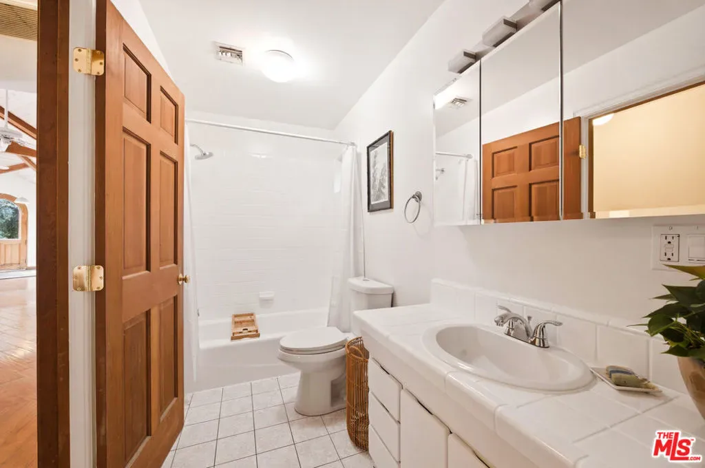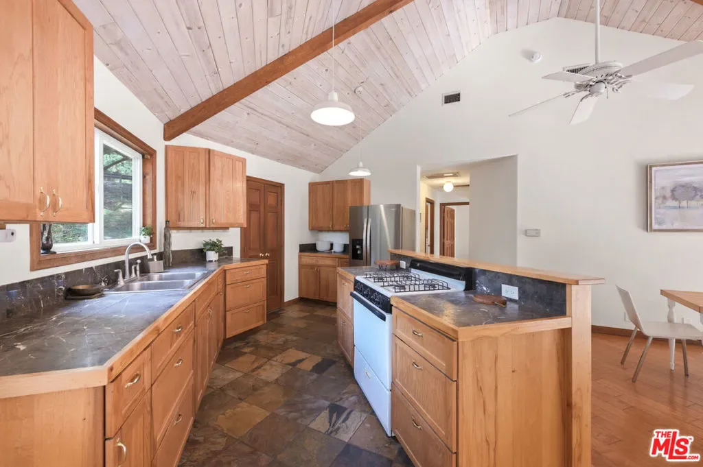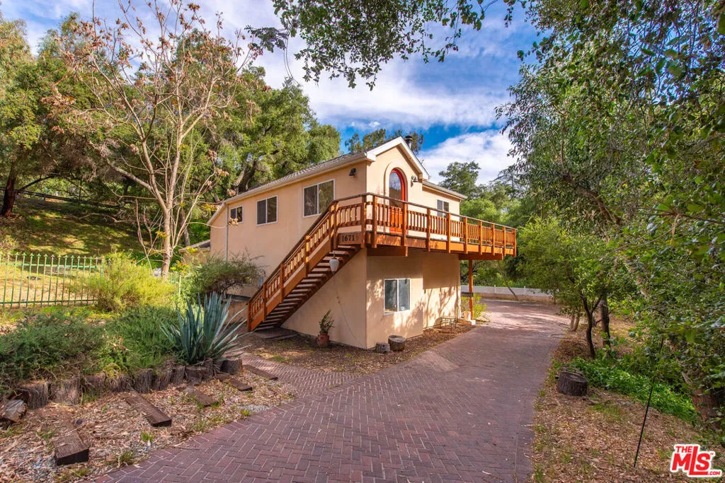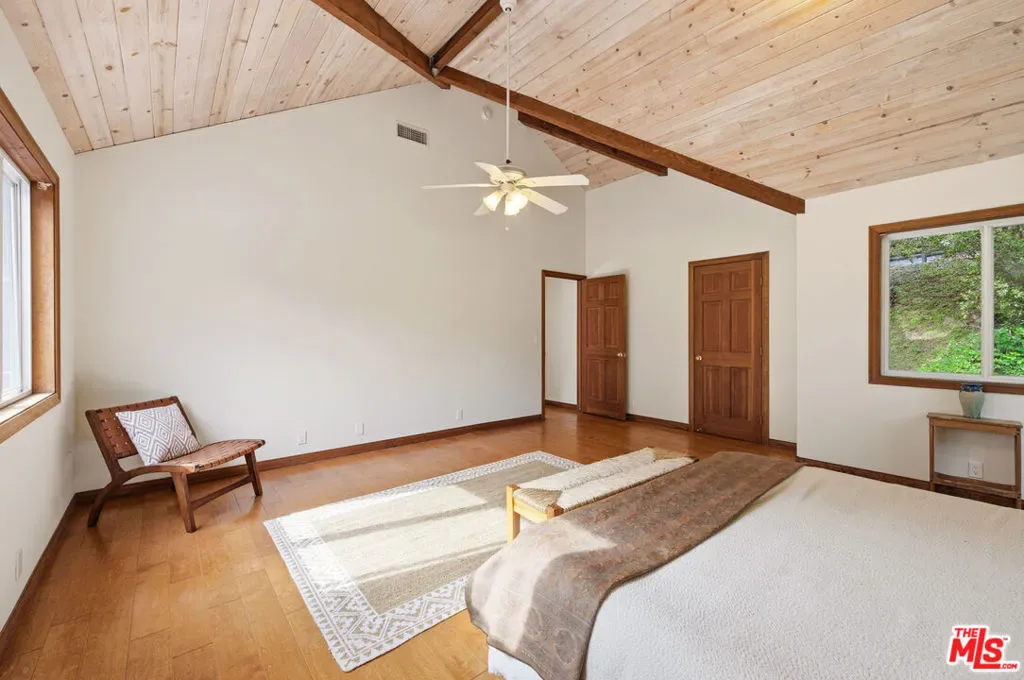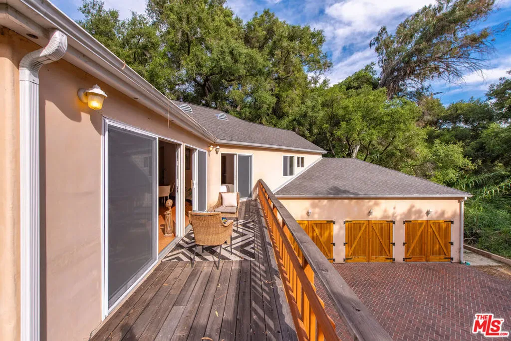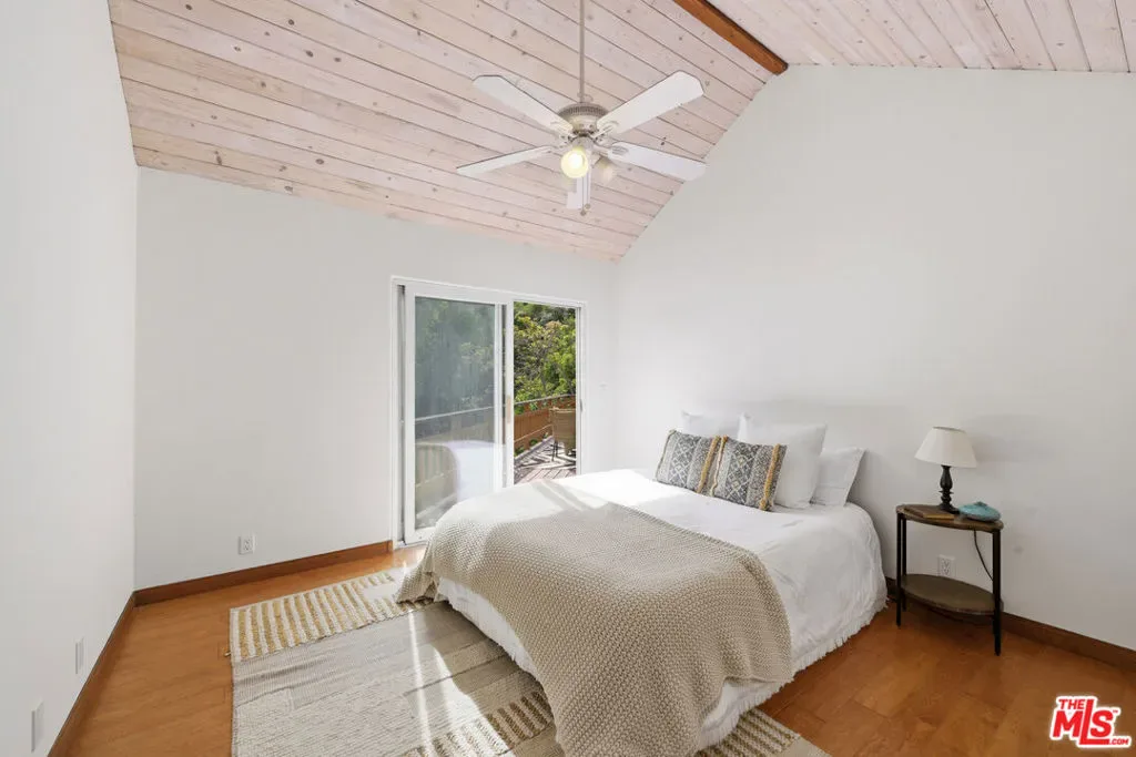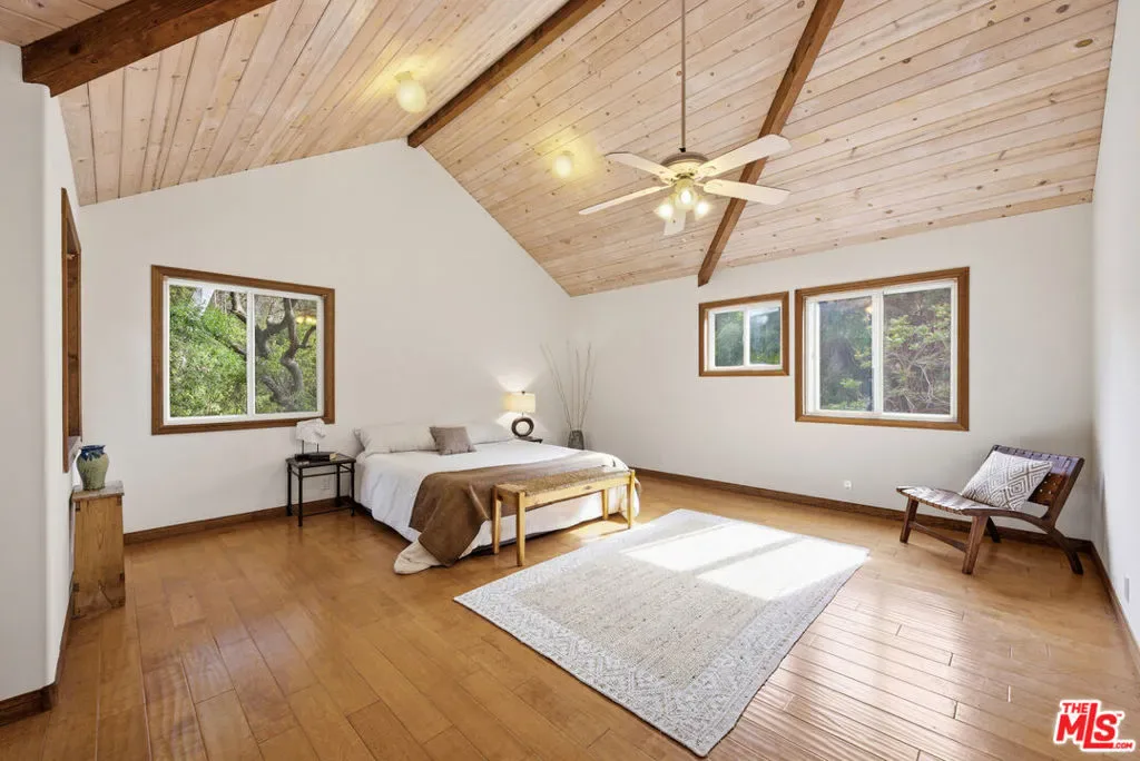 Discover your dream retreat in this delightful chalet featuring 2 cozy bedrooms and a full bath. The soaring vaulted ceilings and expansive windows create a light-filled ambiance, perfect for relaxation. Enjoy the warmth of the wood-burning fireplace while admiring the beautiful hardwood floors throughout. Step outside to the wrap-around deck, ideal for enjoying the serene surroundings. The common area yard adds extra charm, making it a sweet spot for gatherings. Located just minutes from The Living Cafe, Cafe 27, and the heart of town, as well as beautiful beaches and easy access to SFV and Santa Monica, this chalet is a special home waiting for you!