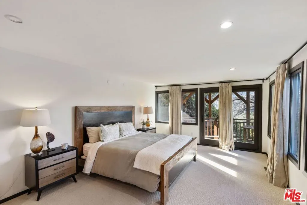 Tucked into the hills of Topanga, this rare 1930s retreat blends timeless character with thoughtfully curated modern updates and sweeping canyon and mountain views. Original hardwood floors, vaulted ceilings and exposed wood beams create a warm and authentic atmosphere, while expansive windows frame the surrounding landscape. The main living level features a dramatic living room with soaring ceilings and a wood-burning stove, flowing into the dining area and remodeled chef’s kitchen with custom walnut cabinetry, volcanic stone countertops, a Viking range and an adjacent lounge area ideal for entertaining. Two guest bedrooms on this level enjoy peaceful views, along with a full bathroom with backyard access and a convenient half bath with double sinks. The lower level offers a serene primary suite with a spa-like en-suite bath featuring dual sinks, a clawfoot tub and a glass-enclosed shower, plus an oversized flexible room perfect for a screening room, office or creative space. Outdoors, enjoy a private, resort-style setting with lush landscaping, a saltwater pool and spa, expansive patios and multiple outdoor living areas. A true Topanga escape approximately six miles to Woodland Hills and ten miles to the beach.