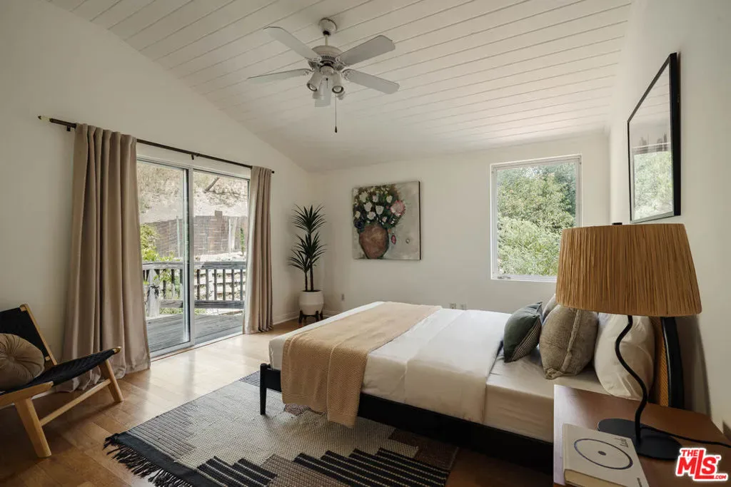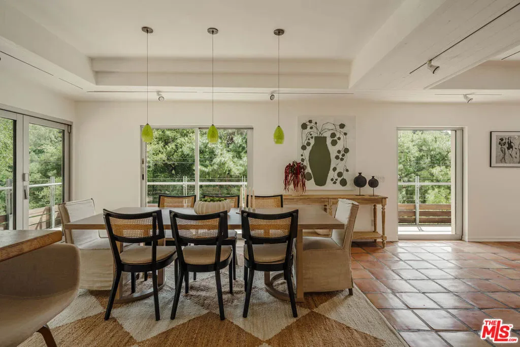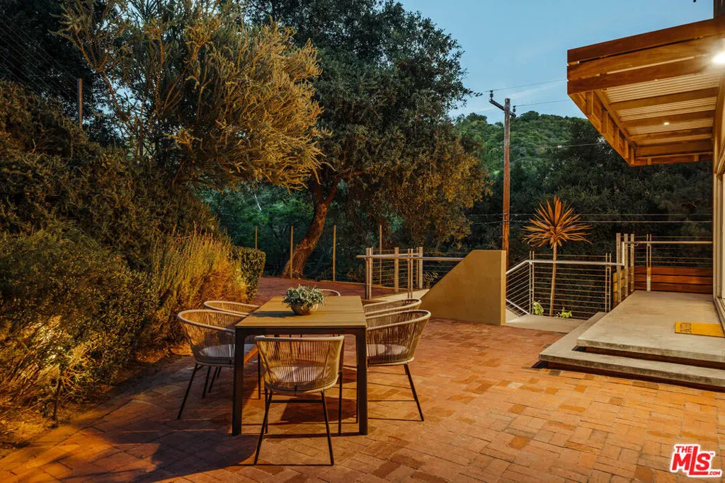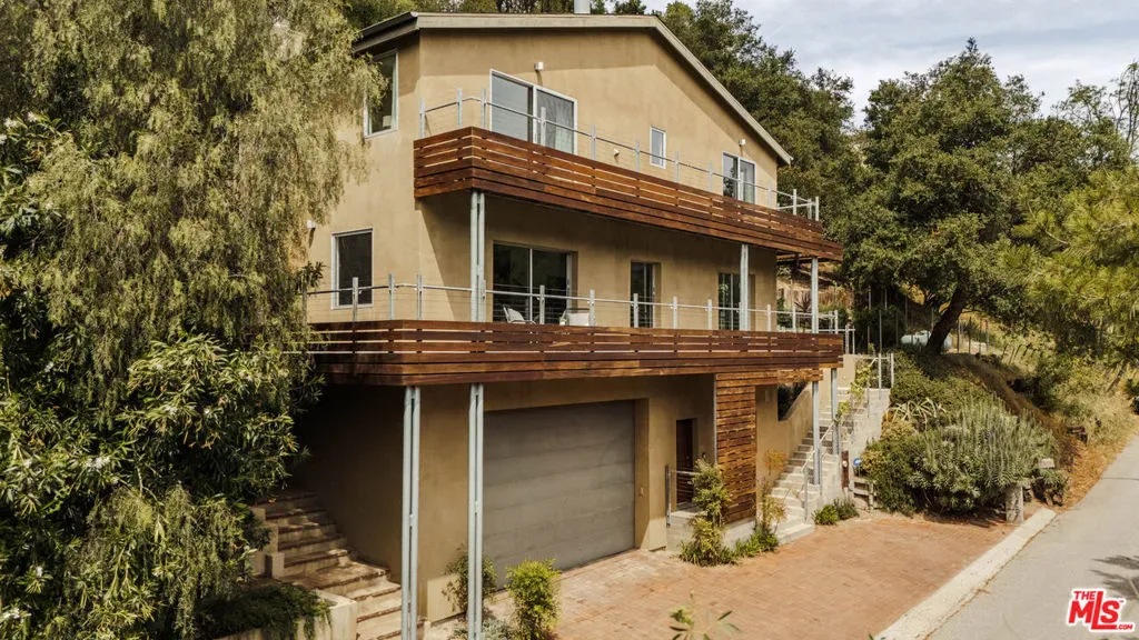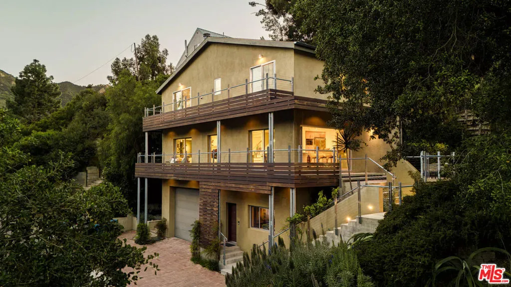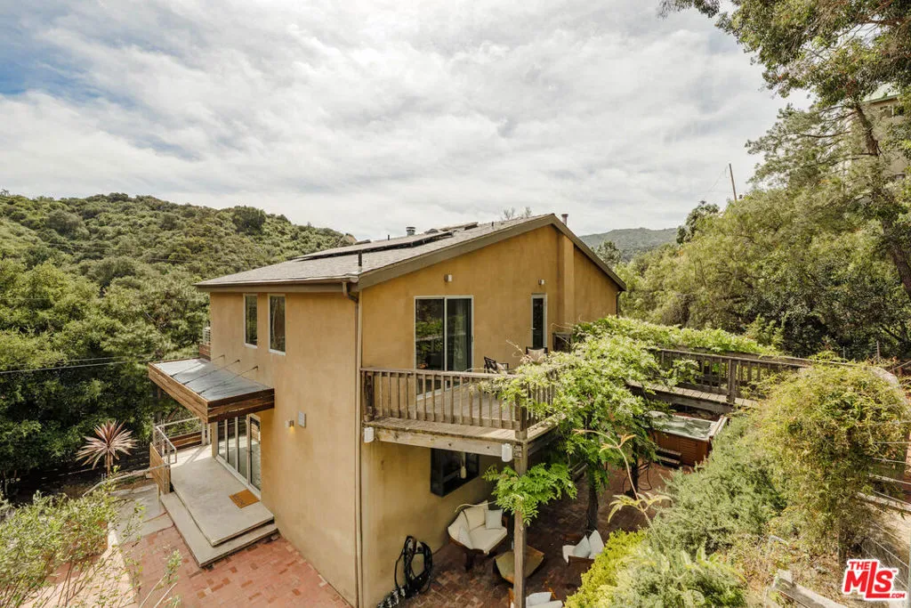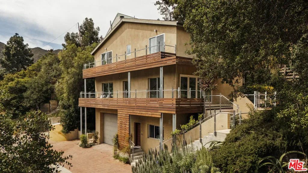 Nestled in one of Topanga Canyon’s quieter pockets, this home offers an intimate connection to the surrounding canyon with views of Saddle Peak Ridge, where you can hear frogs in the creek and watch hawks soar overhead. Built by local builder Maurice Bourget and renovated in collaboration with architect John Jennings, the home spans three levels and is designed for easy indoor-outdoor living. The main level features a folding front entry and Fleetwood pocket doors that disappear completely, letting canyon breezes flow through the house and out onto the wrap-around balcony. The living room centers around a wood-burning fireplace, with windows framing the canyon on one side and the backyard hot tub on the other, while the kitchen is well-equipped with a six-burner chef’s stove, wine cooler, walk-in pantry, RO and hot water tap. A guest bathroom on this level offers direct access to the backyard. Upstairs, skylights pour light into the hallway leading to three bedrooms. The primary suite looks out over the surrounding canyon with its own fireplace, en-suite bath, walk-in closet, and private balcony, a peaceful place to start and end the day. The second bedroom shares the balcony with the primary and has a charming view of the backyard, and the third bedroom has access to a deck leading out into the yard. Each room finds its own quiet connection to the landscape. The primary has its own en-suite bath, and a shared bathroom serves the second and third bedrooms. The ground level houses a theater room with projector and screen, and a full bath, equally suited as an office or guest suite, alongside an oversized garage with 20-foot ceilings. Outside, native landscaping surrounds a large brick patio with multiple seating areas connected by a walkway that winds through the backyard, with spots to sit, unwind, and take in the natural setting at every turn. The property comes with a 16-panel solar system, fully paid off. Just minutes from Old Topanga Canyon Road and about 15 minutes from Calabasas, this is a well-built, comfortable home in a beautiful part of the canyon, ready to be made your own.