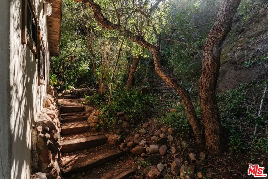 At the entrance to Red Rock Canyon, a hidden sanctuary awaits three magical cottages set among winding garden paths, mature oaks, and an acre of canyon landscape. Step outside your door and onto miles of hiking trails through one of Topanga’s most beloved natural areas.The Butterfly House is a 1-bedroom, 1-bath vintage cabin rich in character, featuring stone accents, skylights and stained glass, two wood-burning fireplaces, a clawfoot tub, and a handcrafted kitchen with a Viking range. Upstairs, an airy bedroom opens out to a bridge that leads you into the garden.Follow the winding path to the Teahouse, set against the red rocks a quiet refuge complete with a lofted sleeping space, pebble-stone spa bath, and soaking tub.Above it all, the Angel’s Nest a glass-and-wood studio rests in the treetops, offering a wood stove, infrared sauna, spa bath, expansive decks enveloped by the oaks and intimate canyon views.Set on an acre of land with a seasonal creek across the road, native plants and fruit trees throughout, plus modern system upgrades, a one-car garage plus 3 parking spots, and an additional storage shed. Located in the beloved Old Canyon / Red Rock community just a few minutes from the Topanga town center and approximately 15 minutes to the beach and Calabasas this special property offers the rare balance of privacy, nature, and convenience.