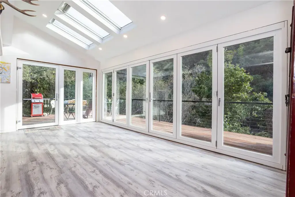 The home features light-filled interiors, an open living layout, vaulted ceilings with skylights, and flexible living spaces designed to connect with the outdoors. The property is currently configured with additional bedrooms and bathrooms without permits; buyer to independently verify square footage, room count, and all improvements.