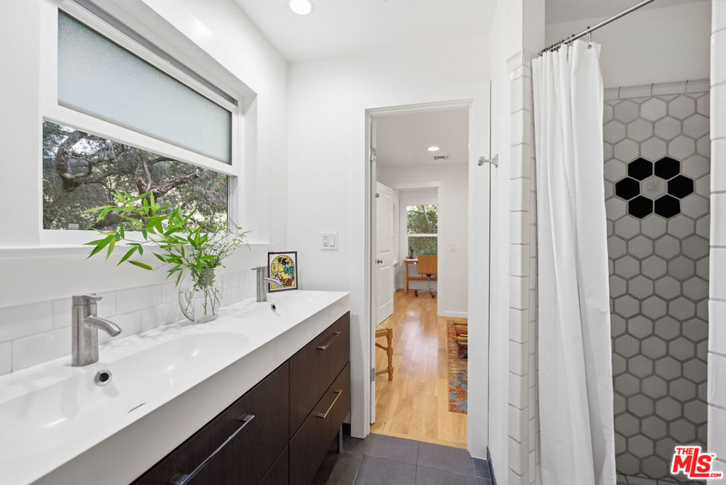 Stunning Topanga retreat fully remodeled 3 bed, 2 bath oasis blending canyon charm with modern luxury with double lot. Minutes from Mimosa Cafe, Malibu beaches, and Santa Monica, set in an unbeatable microclimate with mountain views and a seasonal creek. Sun-drenched open living/dining/kitchen flows to a porcelain-tiled wraparound deck via French doors perfect for entertaining or peaceful mornings. Chef-ready kitchen with quartz Caesarstone, stainless steel appliances, Bosch dishwasher, soft-close cabinets and thoughtful built-ins. Private downstairs primary suite with ensuite, walk-in closet and laundry. Premium finishes: oak and porcelain floors, double-pane windows, efficient Bryant heat-pump HVAC, newer roof and HW heater. Huge detached 2-car garage with EV charging, motion-lit exterior stairs, generous yard turnkey canyon living done right.