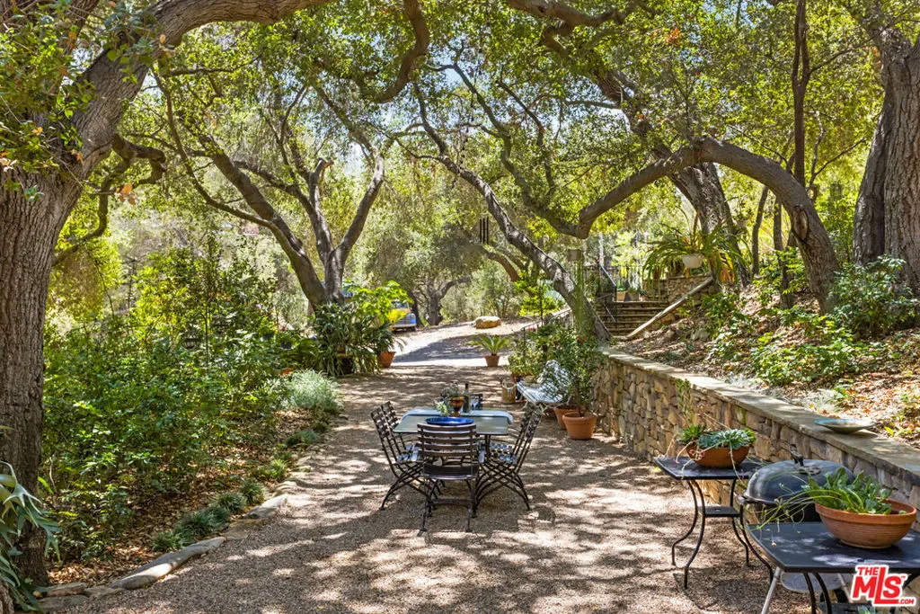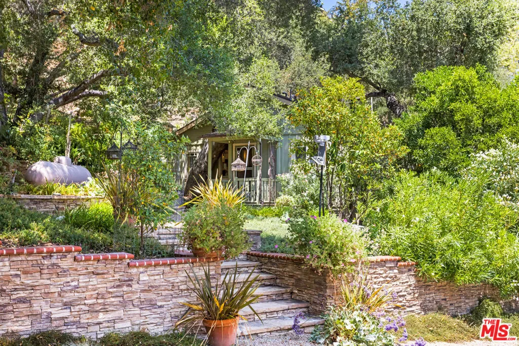 This One-of-a-Kind Estate is located in the most enchanting area of Topanga: Greenleaf Canyon. It offers a rare opportunity to embrace nature and tranquility on 8 plus acres bordered by the Topanga State Park open space. Rock ledges, mountain terrain, cross canyon views are many, long and spectacular. This property celebrates the very best of Topanga’s natural beauty. This offering features three stunning homes. Each is custom built to perfection: high ceilings, attention to detail, and fine craftsmanship. All three include spacious decks and generous stone or brick patios and walk-ways. In addition to the three homes, the property includes a large two story accessory building with loft and decks, currently use for creating one of a kind unique craftsman furniture, artistic work and designs. This incredible “over-built” building offers great potential for an easy creative conversion to a 5000 plus square foot home. It invites your imaginative spirit to work with the currently seven large separate areas and transform into a dream kitchen, living-dining -area, primary bedroom with ensuite bathroom and walk-in closets, art studio, exercise room, library-office, recording studio, entertainment center, up to four luxurious bedroom suites, and more. Several professional architectural renderings have been prepared to demonstrate possible existing room transformations and stimulate your own creative visions. Every view from this bonus building is different and outstanding. There is ample space in two locations for a swimming pool/spa. The property is blessed with the best of Topanga’s natural vegetation including many magnificent old oak trees distributed throughout the property and accompanied by seasonal creeks and whimsical bridges. The many paths and trails that interconnect all parts of the property pass through well placed fruit tree orchards, vegetable gardens, and decorative landscaping. It welcomes immersing oneself in nature’s wonderful miracles. It’s not an overstatement to describe this property as PERFECT.