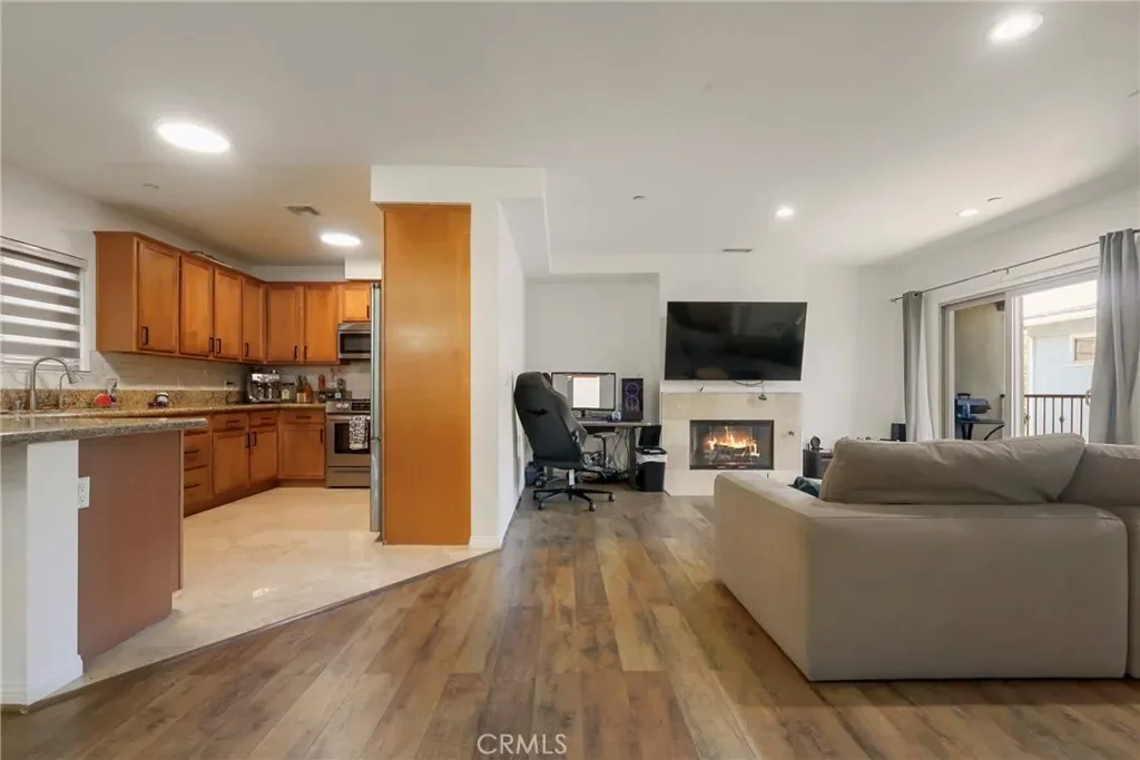 Move-in ready tri-level townhome featuring 3 bedrooms, 2.5 bathrooms, and approximately 1,860 sq ft of well-designed living space. The bright living room showcases laminate flooring and a dual-use gas and wood-burning fireplace that opens to a private balcony—perfect for relaxing or entertaining. The entryway, kitchen, bathrooms, and laundry areas feature premium natural stone finishes, while the kitchen is highlighted by granite countertops and modern appliances.