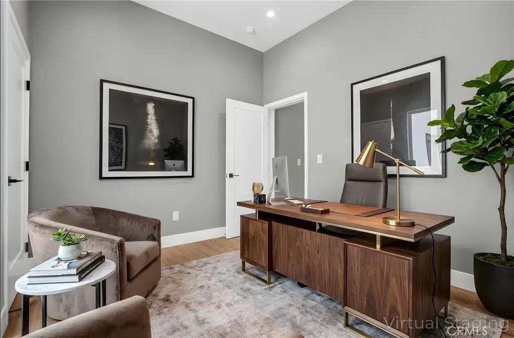 Additional highlights include a main-level bedroom and bath, ideal for guests, a home office, podcast/yoga room, or creative space, plus a two-car garage and multiple outdoor areas for entertaining or relaxing under the Southern California sky.