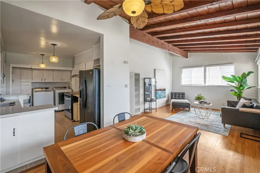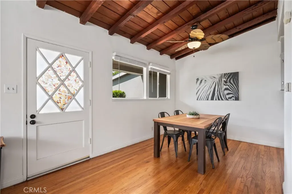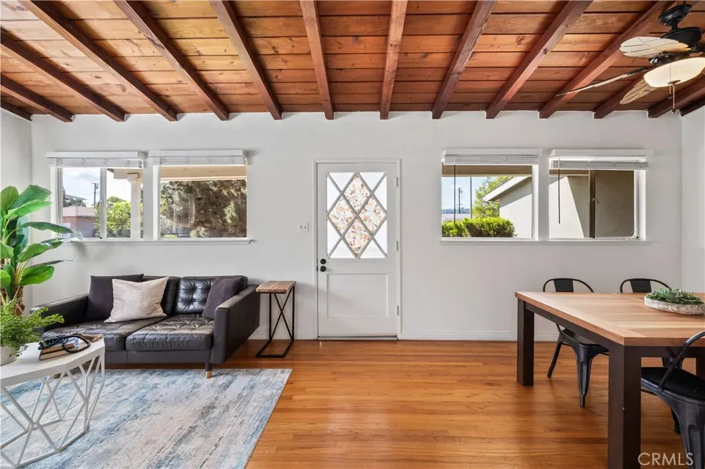 Opportunities like this don’t come around often; especially in South Torrance! Set on a quiet street this one level, single family, four-bedroom, two-bath residence blends style, comfort, and thoughtful design. A brick driveway and pathway leads to a covered front porch overlooking a fenced front yard, creating a welcoming approach. Inside, wood-beamed ceilings and continuous wood flooring define the main living areas, where an open dining space flows seamlessly into the kitchen, appointed with quartz countertops, a tiled backsplash, and white cabinetry. A dedicated laundry area with a utility sink and additional storage is thoughtfully integrated for everyday convenience. All four bedrooms are well-proportioned, with three featuring ceiling fans and mirrored closet doors that enhance both light and functionality. Two bathrooms, conveniently located nearby, offer a combination of a shower-tub and a separate walk-in shower, providing flexibility for a variety of needs. An enclosed patio extends the home’s space, ideal as a secondary lounge, dining area, or flexible bonus space, with screen doors that open to the private backyard. Outdoors, the backyard offers a grassy lawn framed by mature landscaping, along with a lemon tree and avocado tree, creating a relaxed setting for everyday living or entertaining. A spacious and drywalled two-car garage adds additional utility and storage. Ideally located near Del Amo Fashion Center, Torrance Beach, and Old Torrance, with convenient access to the 405 and 110 freeways. This home also enjoys access to top rated Torrance schools, offering a well-balanced combination of comfort, convenience, and coastal proximity. Bright, comfortable, and easy to love; this is a home that simply feels good to be in.
