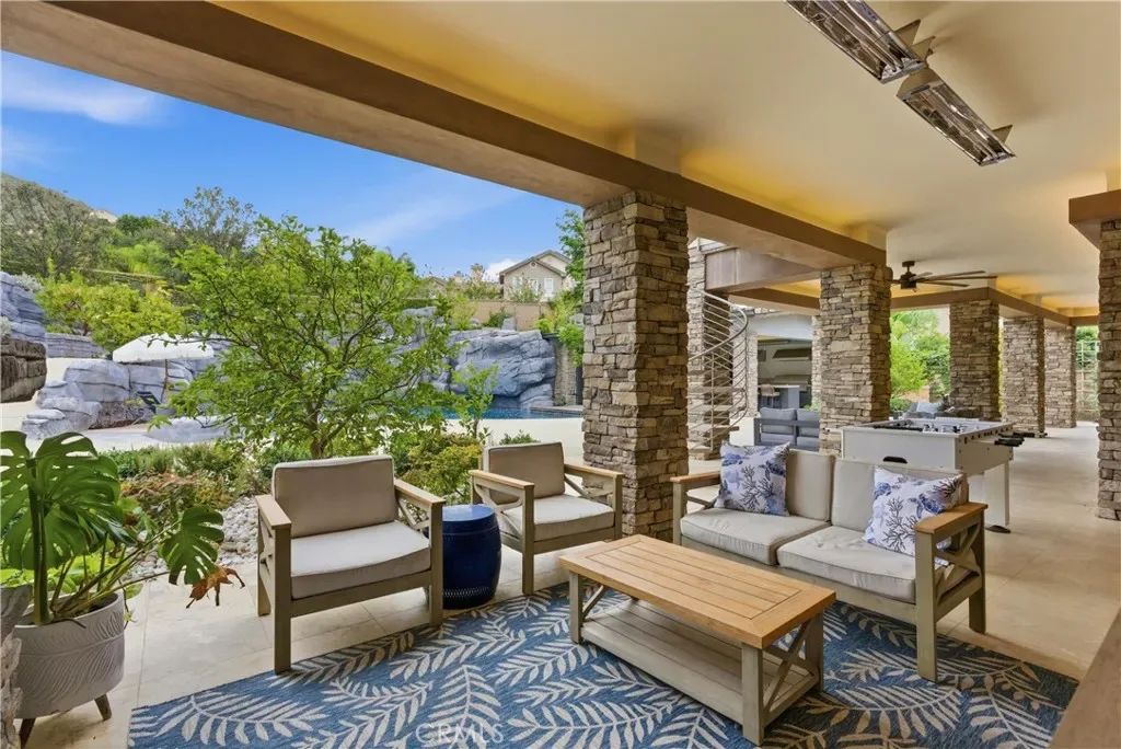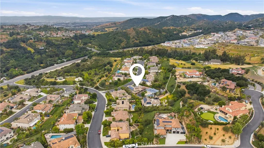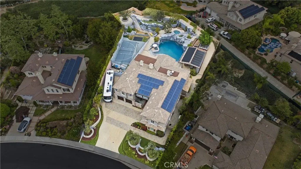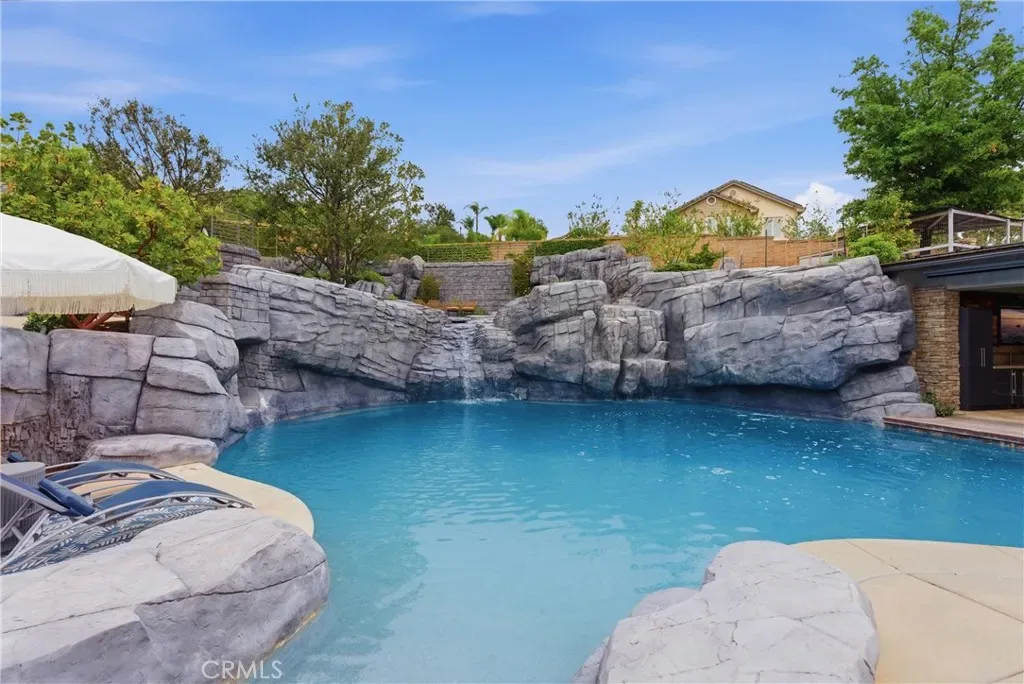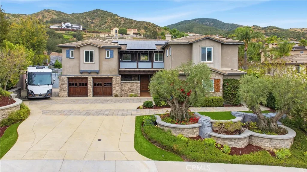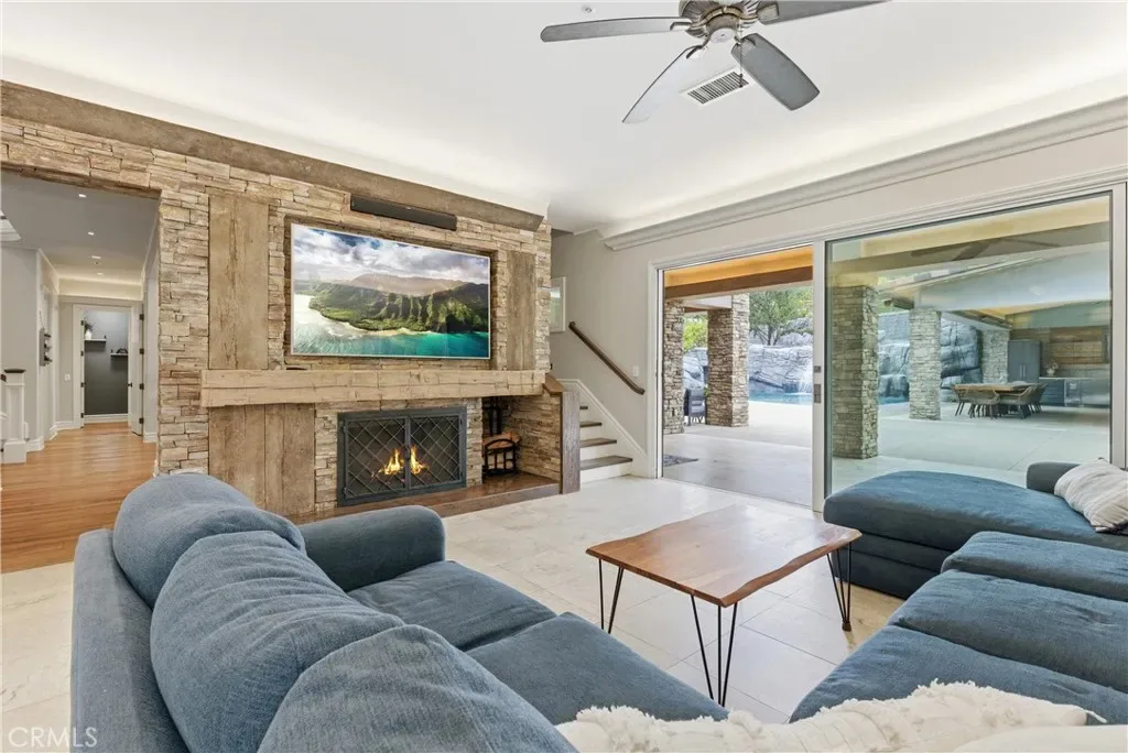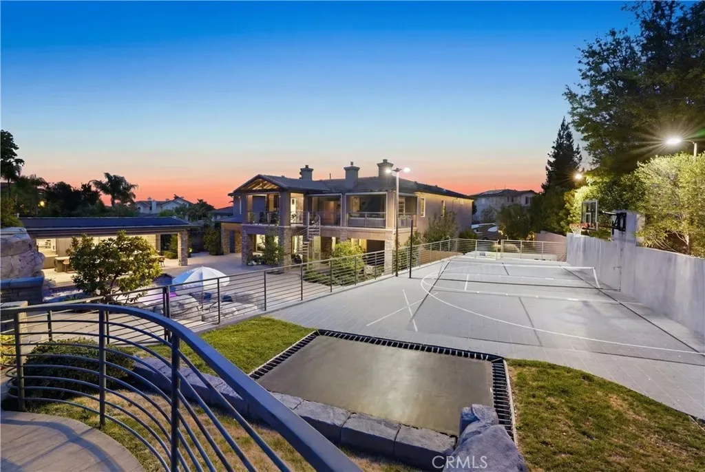 Tucked within Santiago Canyon Estates, this private resort-style home is designed around outdoor living, recreation, and entertaining, featuring expansive grounds with a rock pool, water slide, spa, and natural rock jumping ledge into a 10-foot deep pool, creating a private backyard retreat. Outdoor living areas include a fire feature integrated into the pool, a covered patio with built-in fireplace and heaters, and an upper seating area capturing canyon and hillside views, along with multiple seating and dining areas throughout the yard, plus a putting green, in-ground trampoline, and a sports court that can also be used for pickleball. The outdoor kitchen, built in 2019, includes a built-in BBQ, smoker, pizza oven, ice maker, microwave, soft-close cabinetry, heaters, sunshade and windscreen, full-size refrigerator, and refrigerator drawers, forming a fully equipped outdoor kitchen and entertaining space, while the backyard also includes two outdoor bathrooms, an outdoor shower, and 16 fruit trees throughout the property. The home opens to an interior featuring handcrafted hardwood flooring, custom crown molding with integrated recessed lighting, plantation shutters, built-ins, and multiple living and bonus rooms. The layout includes elevator access to the second level, a main floor bedroom and bathroom, and a separate staircase leading to a second wing, providing flexible space for guests, office space, or multi-generational living. The large family room is anchored by a massive fireplace and opens directly to the outdoor kitchen and covered entertaining areas with tile flooring that seamlessly transitions from the interior to the covered outdoor space, creating true indoor-outdoor living. A spacious dining area sits between the kitchen and family room, ideal for entertaining, and the kitchen features Taj Mahal quartzite countertops, two-tone cabinetry, a large center island, walk-in pantry, refrigerator drawers, full-size refrigerator, and two microwaves. Additional features include paid solar, whole house generator, EV charging, new windows and doors, water purification system, luxury HVAC, three tankless water heaters, upstairs and downstairs laundry rooms, and RV storage on site, creating a home designed for private resort-style living in Santiago Canyon Estates near hiking trails, outdoor recreation, and Orange County shopping, dining, and coastal destinations.