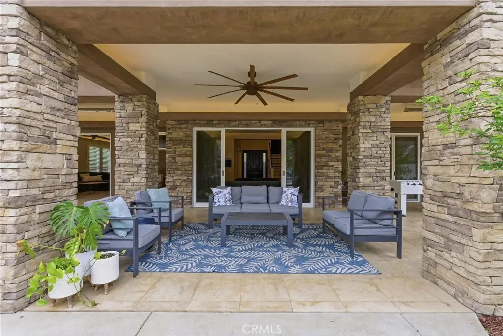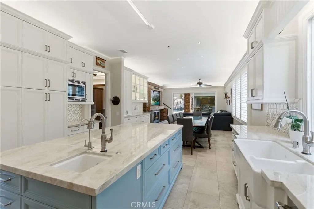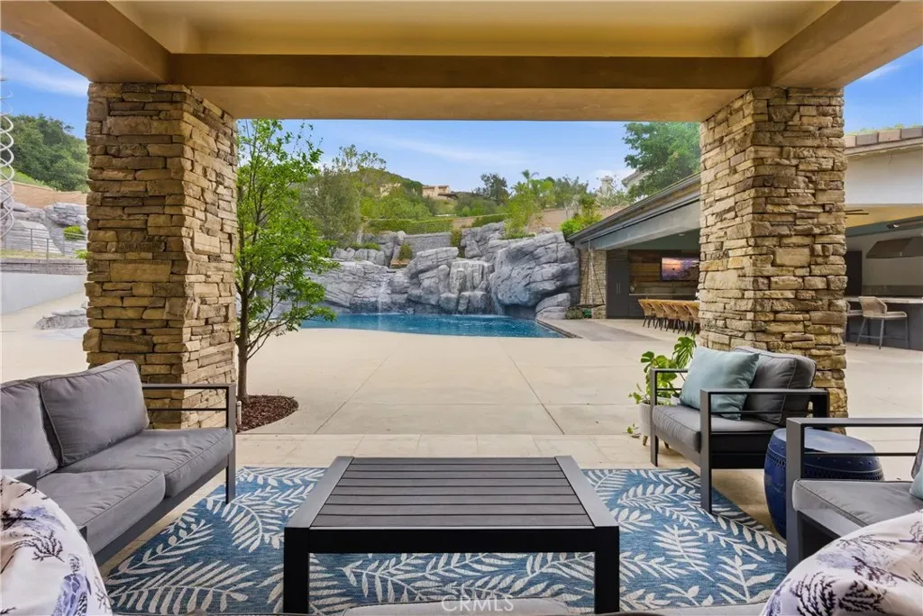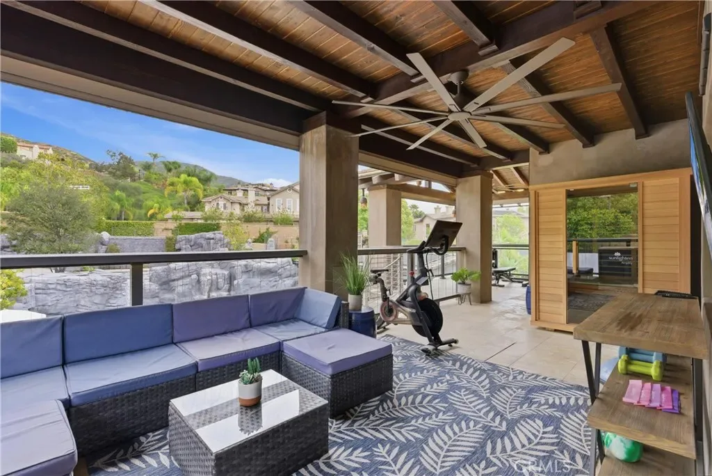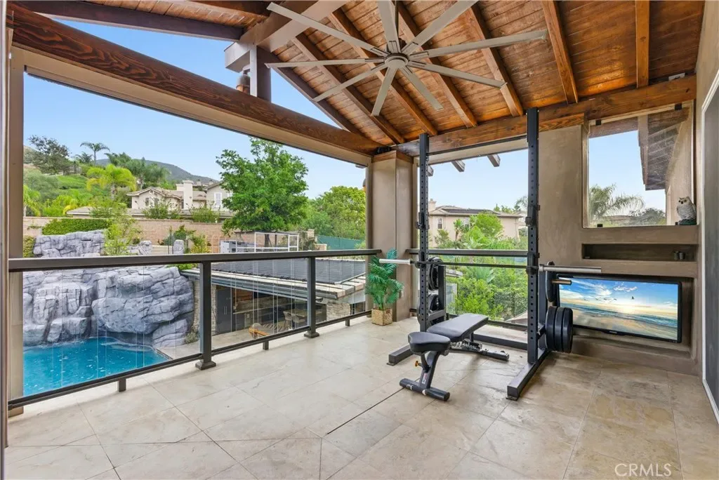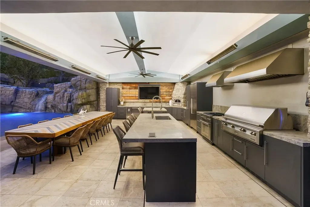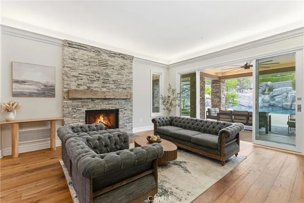 Tucked within Santiago Canyon Estates, this private resort-style home is designed around outdoor living, recreation, and entertaining, featuring expansive grounds with a rock pool, water slide, spa, and natural rock jumping ledge into a 10-foot deep pool, creating a private backyard retreat. Outdoor living areas include a fire feature integrated into the pool, a covered patio with built-in fireplace and heaters, and an upper seating area capturing canyon and hillside views, along with multiple seating and dining areas throughout the yard, plus a putting green, in-ground trampoline, and a sports court that can also be used for pickleball. The outdoor kitchen, built in 2019, includes a built-in BBQ, smoker, pizza oven, ice maker, microwave, soft-close cabinetry, heaters, sunshade and windscreen, full-size refrigerator, and refrigerator drawers, forming a fully equipped outdoor kitchen and entertaining space, while the backyard also includes two outdoor bathrooms, an outdoor shower, and 16 fruit trees throughout the property. The home opens to an interior featuring handcrafted hardwood flooring, custom crown molding with integrated recessed lighting, plantation shutters, built-ins, and multiple living and bonus rooms. The layout includes elevator access to the second level, a main floor bedroom and bathroom, and a separate staircase leading to a second wing, providing flexible space for guests, office space, or multi-generational living. The large family room is anchored by a massive fireplace and opens directly to the outdoor kitchen and covered entertaining areas with tile flooring that seamlessly transitions from the interior to the covered outdoor space, creating true indoor-outdoor living. A spacious dining area sits between the kitchen and family room, ideal for entertaining, and the kitchen features Taj Mahal quartzite countertops, two-tone cabinetry, a large center island, walk-in pantry, refrigerator drawers, full-size refrigerator, and two microwaves. Additional features include paid solar, whole house generator, EV charging, new windows and doors, water purification system, luxury HVAC, three tankless water heaters, upstairs and downstairs laundry rooms, and RV storage on site, creating a home designed for private resort-style living in Santiago Canyon Estates near hiking trails, outdoor recreation, and Orange County shopping, dining, and coastal destinations.