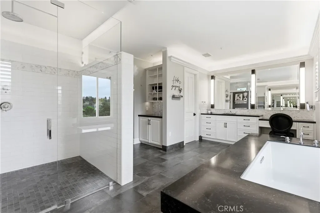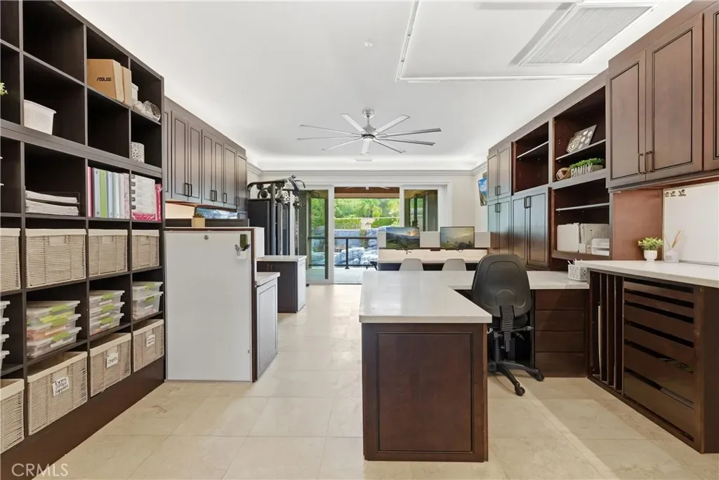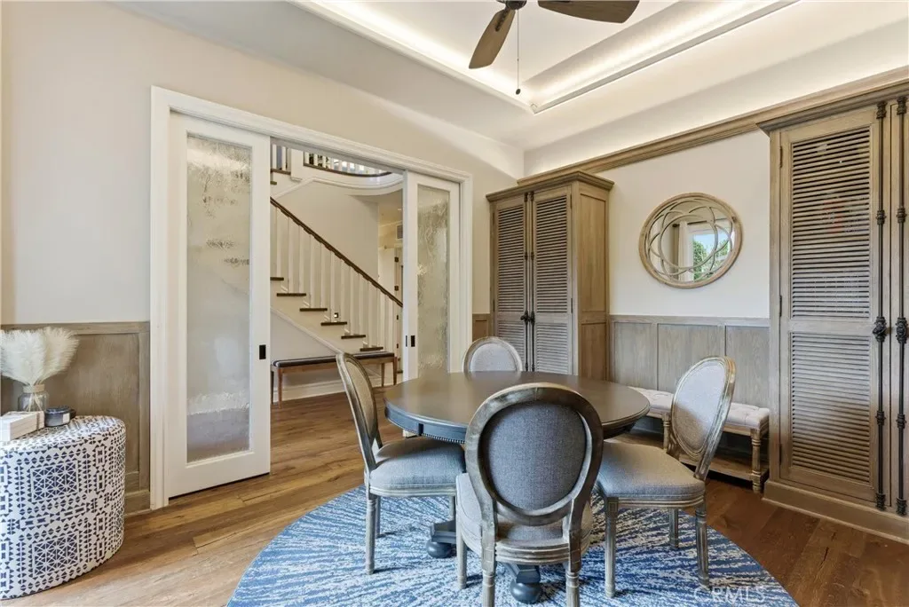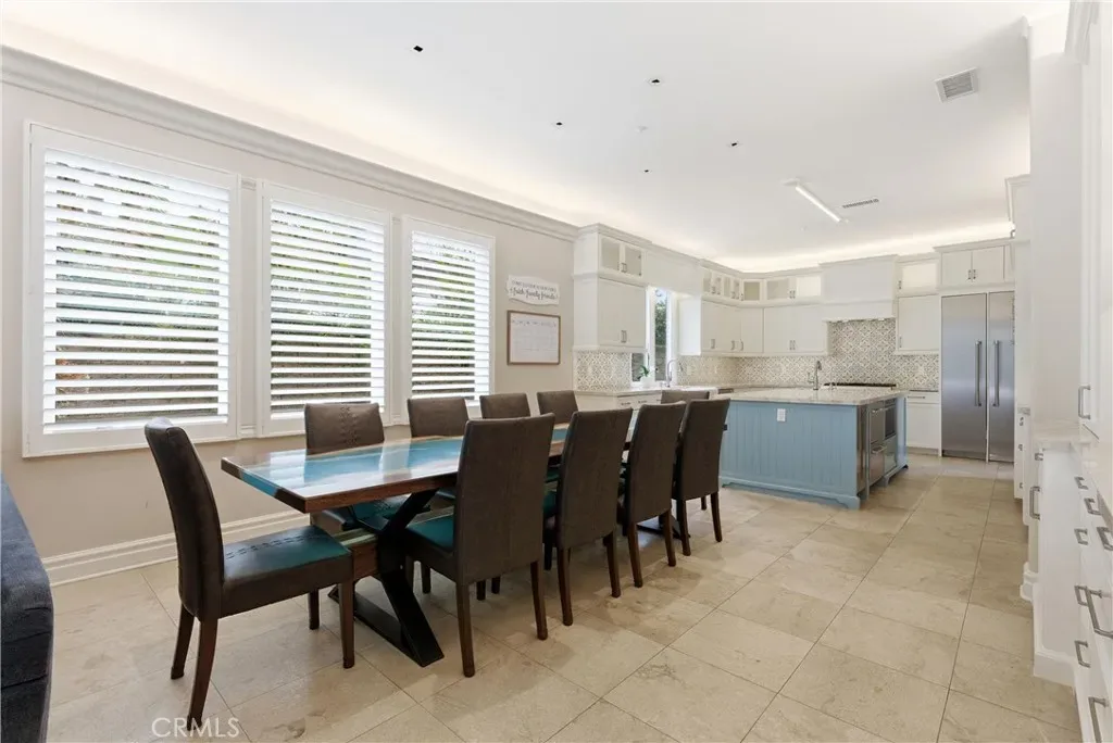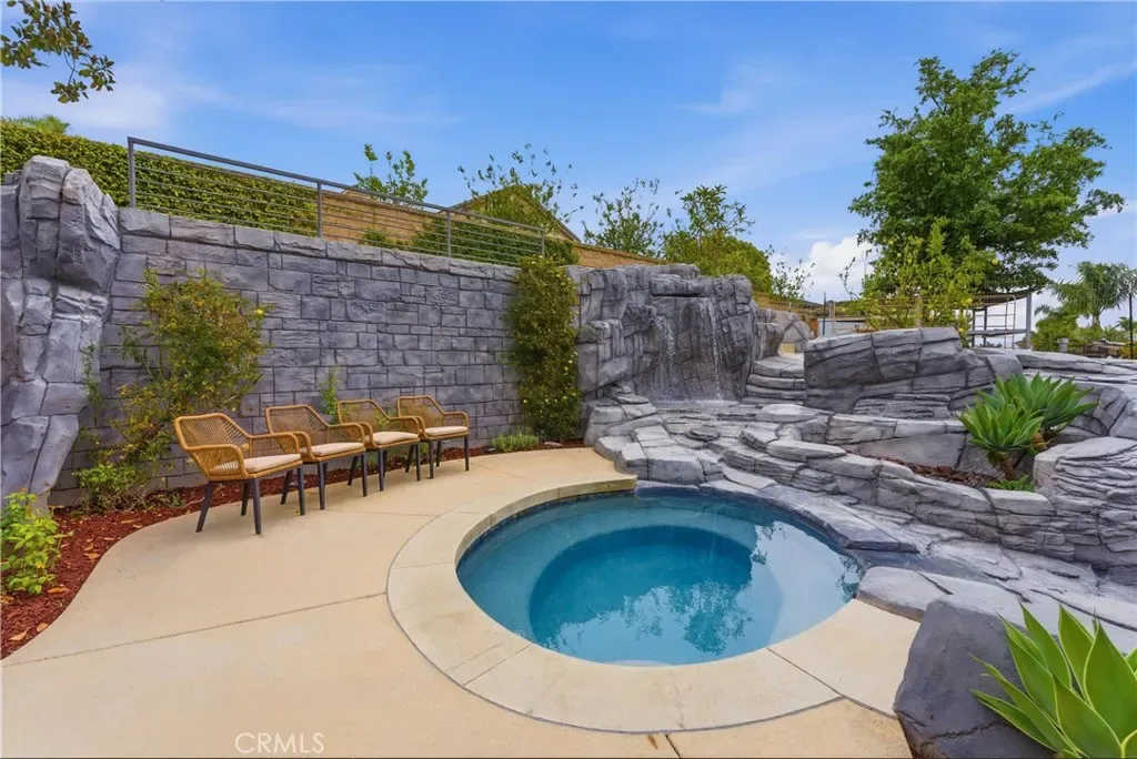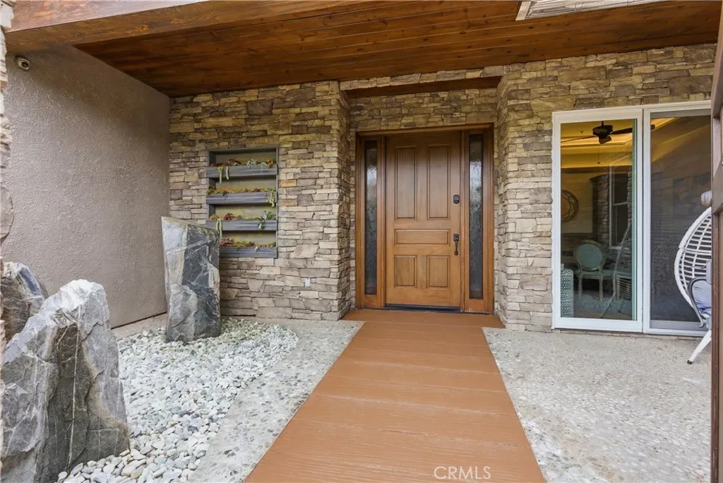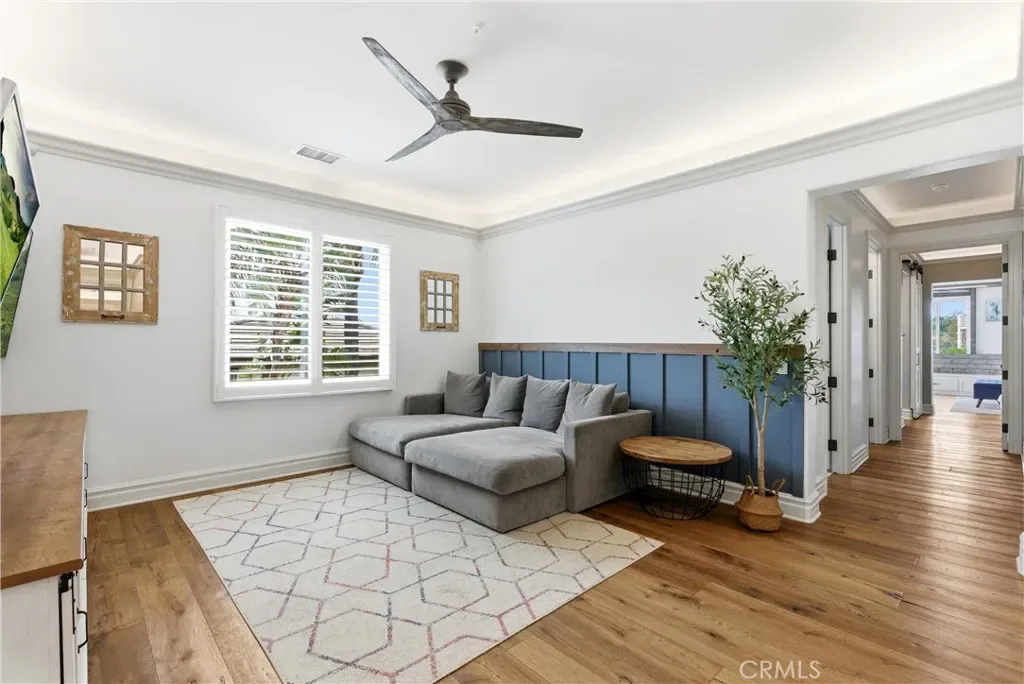 Tucked within Santiago Canyon Estates, this private resort-style home is designed around outdoor living, recreation, and entertaining, featuring expansive grounds with a rock pool, water slide, spa, and natural rock jumping ledge into a 10-foot deep pool, creating a private backyard retreat. Outdoor living areas include a fire feature integrated into the pool, a covered patio with built-in fireplace and heaters, and an upper seating area capturing canyon and hillside views, along with multiple seating and dining areas throughout the yard, plus a putting green, in-ground trampoline, and a sports court that can also be used for pickleball. The outdoor kitchen, built in 2019, includes a built-in BBQ, smoker, pizza oven, ice maker, microwave, soft-close cabinetry, heaters, sunshade and windscreen, full-size refrigerator, and refrigerator drawers, forming a fully equipped outdoor kitchen and entertaining space, while the backyard also includes two outdoor bathrooms, an outdoor shower, and 16 fruit trees throughout the property. The home opens to an interior featuring handcrafted hardwood flooring, custom crown molding with integrated recessed lighting, plantation shutters, built-ins, and multiple living and bonus rooms. The layout includes elevator access to the second level, a main floor bedroom and bathroom, and a separate staircase leading to a second wing, providing flexible space for guests, office space, or multi-generational living. The large family room is anchored by a massive fireplace and opens directly to the outdoor kitchen and covered entertaining areas with tile flooring that seamlessly transitions from the interior to the covered outdoor space, creating true indoor-outdoor living. A spacious dining area sits between the kitchen and family room, ideal for entertaining, and the kitchen features Taj Mahal quartzite countertops, two-tone cabinetry, a large center island, walk-in pantry, refrigerator drawers, full-size refrigerator, and two microwaves. Additional features include paid solar, whole house generator, EV charging, new windows and doors, water purification system, luxury HVAC, three tankless water heaters, upstairs and downstairs laundry rooms, and RV storage on site, creating a home designed for private resort-style living in Santiago Canyon Estates near hiking trails, outdoor recreation, and Orange County shopping, dining, and coastal destinations.
