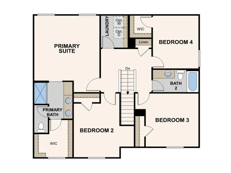 The two-story Marigold plan offers abundant space in an inviting layout. On the main floor, an expansive kitchen–with a center island and corner pantry–flows into a spacious open-concept dining and great room area. Additional main-floor highlights include a convenient downstairs bedroom directly off the foyer. Upstairs, three more secondary bedrooms–one with a walk-in closet –share a full hall bath. You’ll also enjoy a lavish primary suite with an attached bath and walk-in closet.