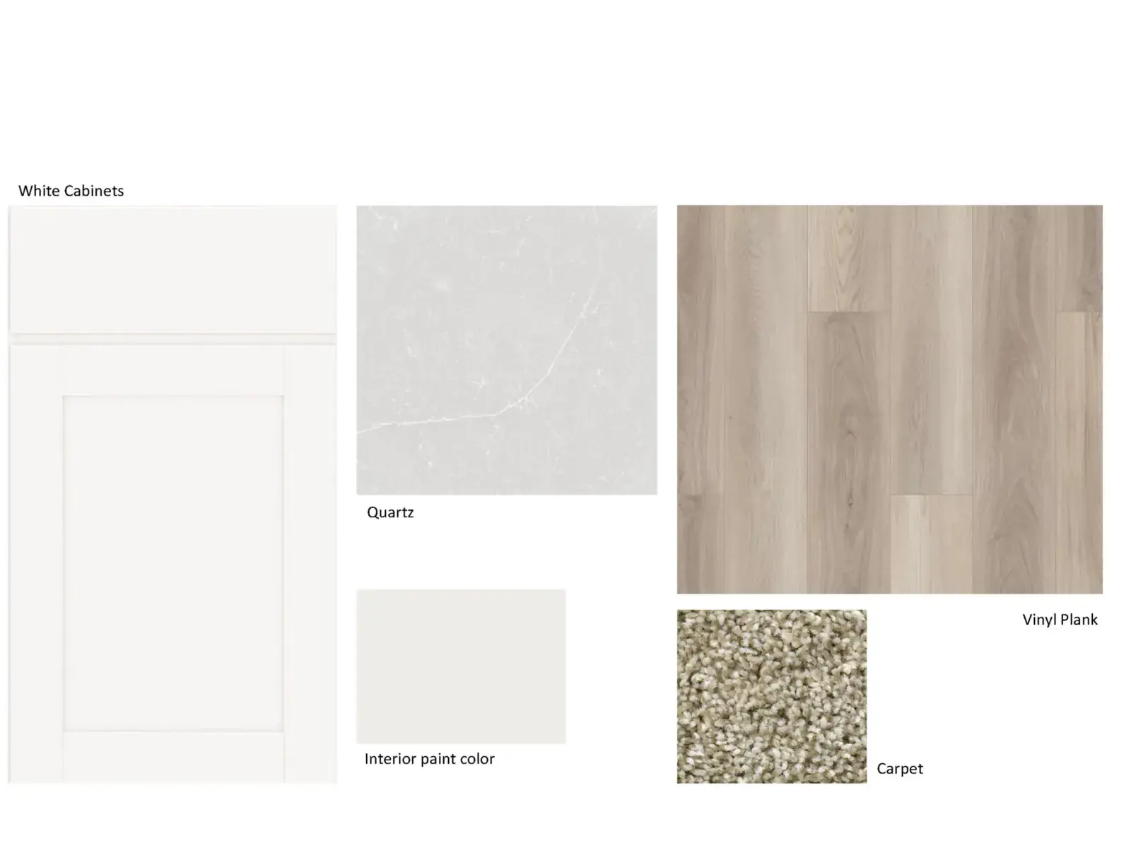 The single-story Abernathy. The great room flows into the dining area and the kitchen, which offers a wraparound counter and a built-in pantry. Toward the front of the home, there are two generous secondary bedrooms and a full bath, while the airy primary suite sits at the back. The attached bath includes dual vanities and a walk-in shower. Upgraded white cabinetry Upgraded quartz countertops Black hardware & fixtures Solid-surface flooring at main living areas Blinds included Spacious owner’s suite North-facing on a 5,550 sq. ft. lot No HOA!